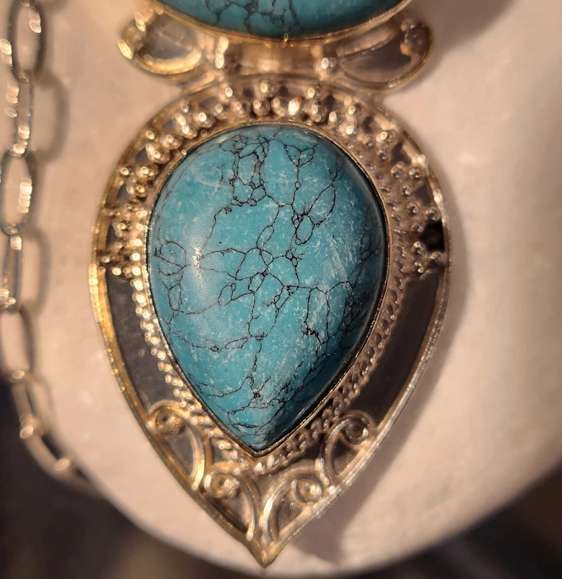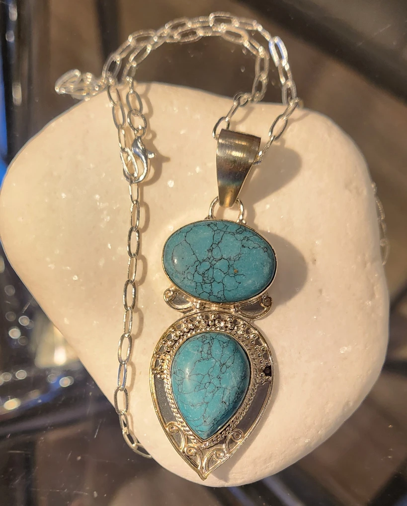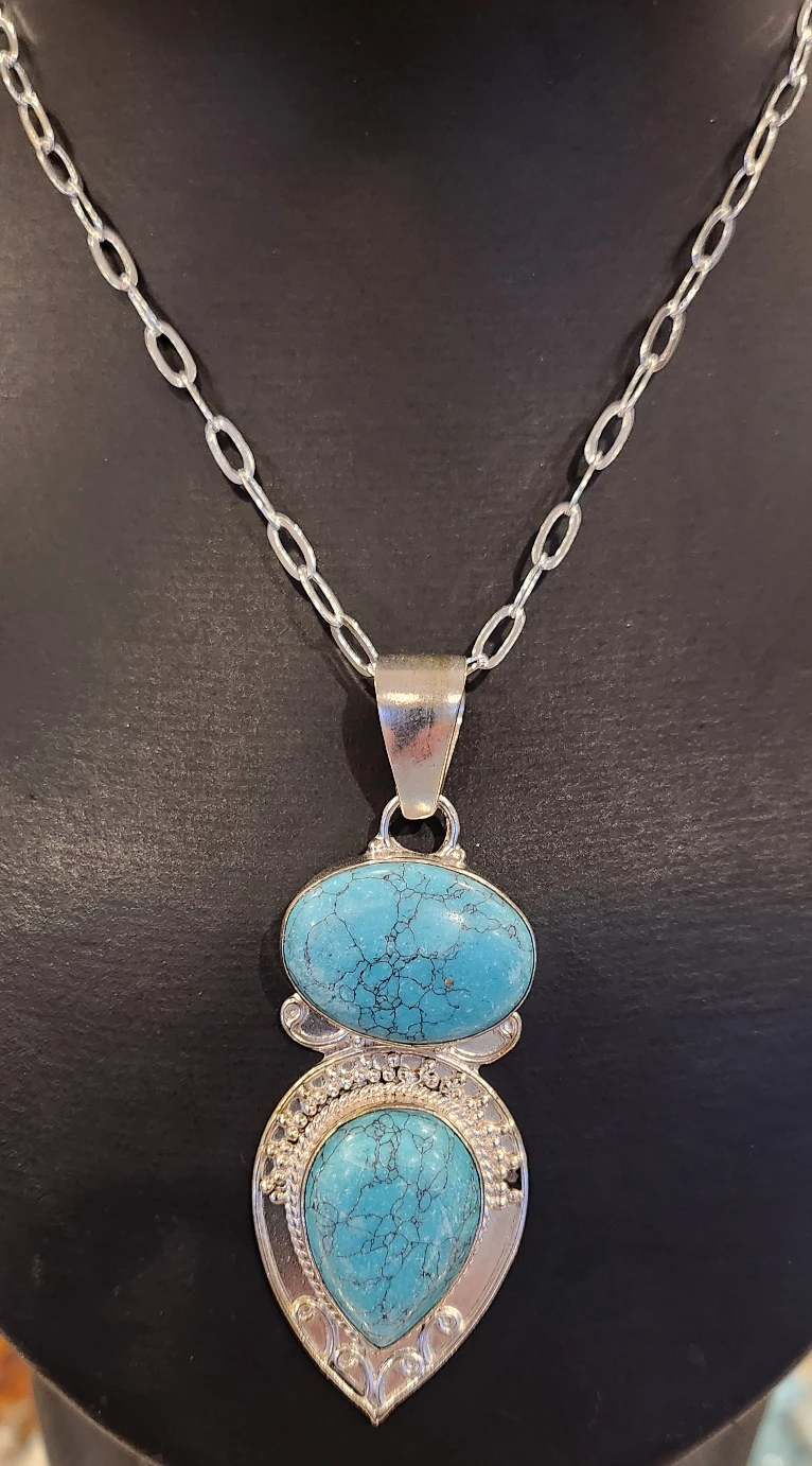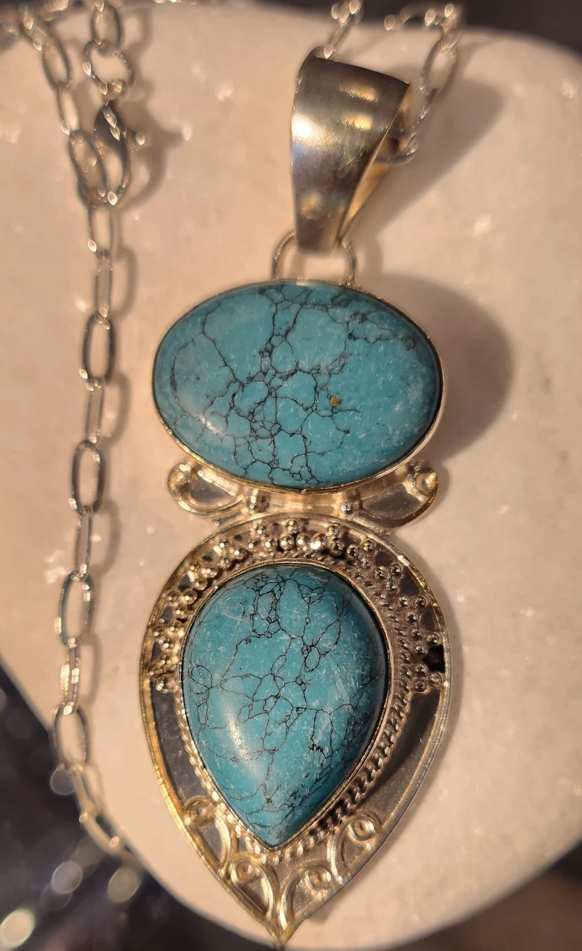 Beautiful turquoise and silver pendant necklace! Tw of the pendant is 15.5 grams,with natural two Turqoises aproximately 26 x 8mm.The pendant is new,and set in sterling silver.It's in great condition and would make a lovely addition to any outfit and would be a lovely gift.