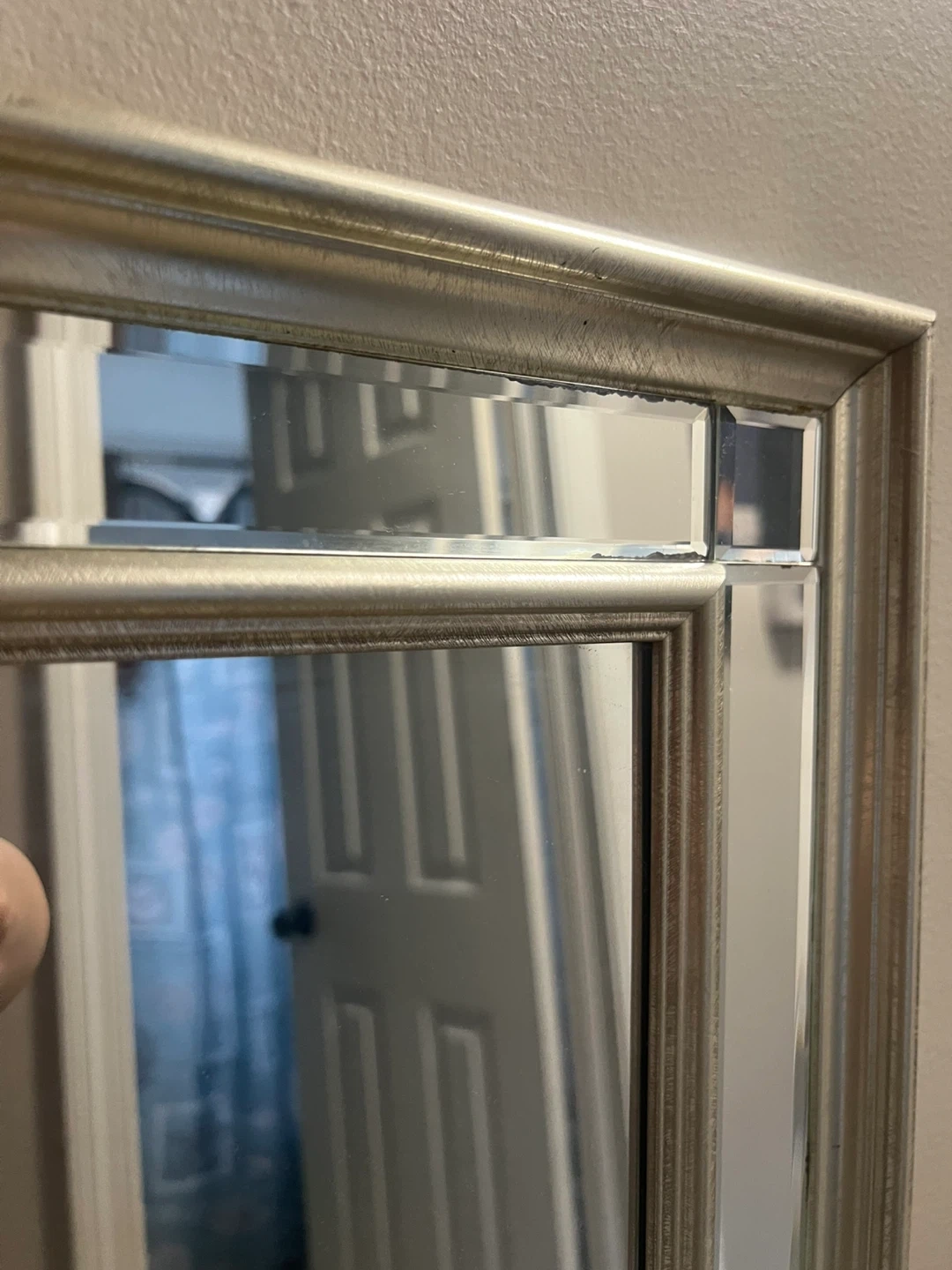 Selling a full length mirror with a silver frame. It's in good condition and ready to brighten up your space! This is a mid, full-length decorative mirror with a beautiful silver frame and beveled glass panel accents. It has a classic, modern style that works great in bedrooms, hallways, or entryways. The mirror is sturdy and ready to hang, it has the original hanging hardware on the back. Condition: • Mirror glass is clear with no cracks • Frame has some light wear and small scuffs (shown in photos) • Backing paper is torn in a few areas, but this does not affect use Approximate Size: Tall, rectangular full-length I'II say about 5 foot tall
