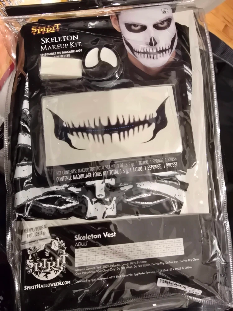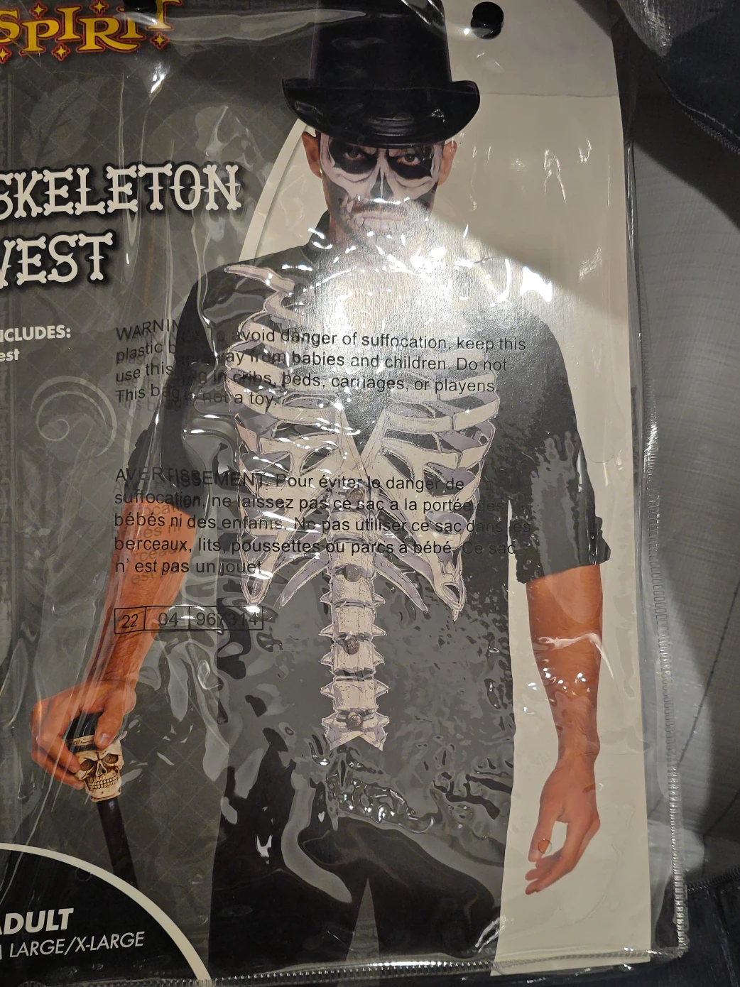 I'm selling a Spirit Halloween Skeleton Vest Costume in adult size Large/X-Large! The material content is 100% polyester