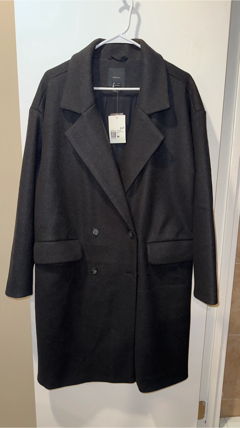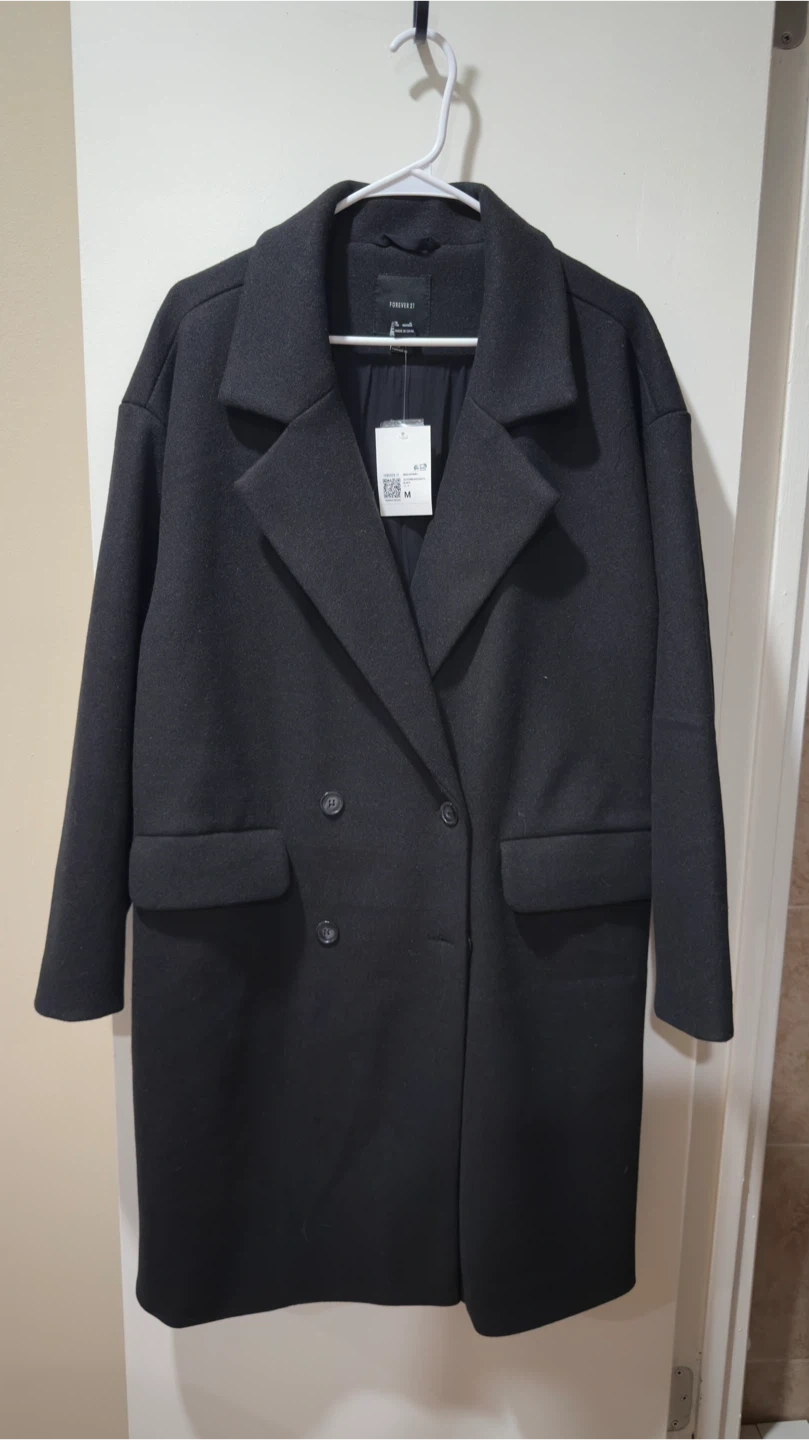 Selling a Forever 21 black double-breasted coat in size M. It's in great condition and ready for a new home! The coat features a classic design with a double-breasted front and a stylish, versatile look that can be dressed up or down. Never used.