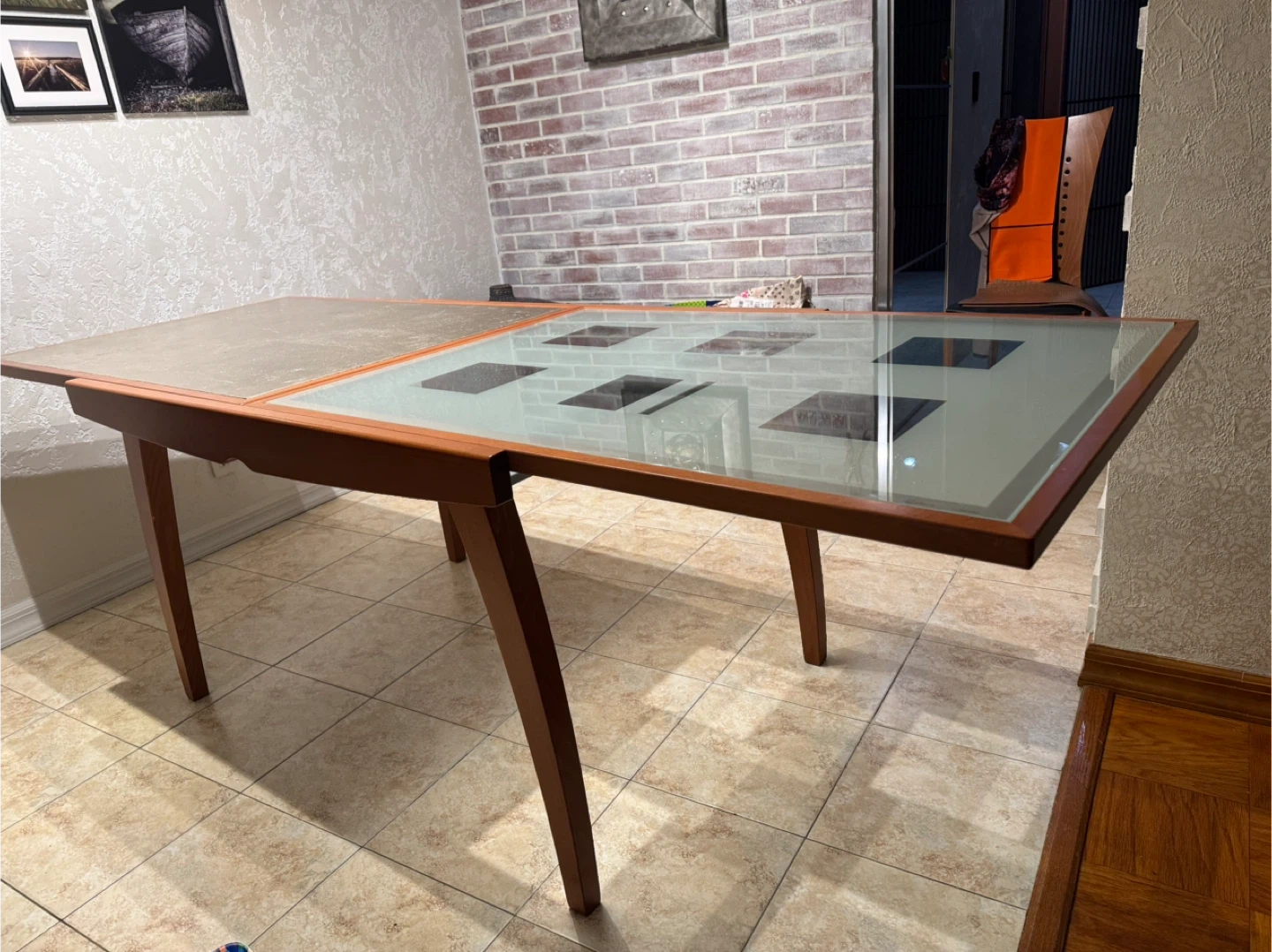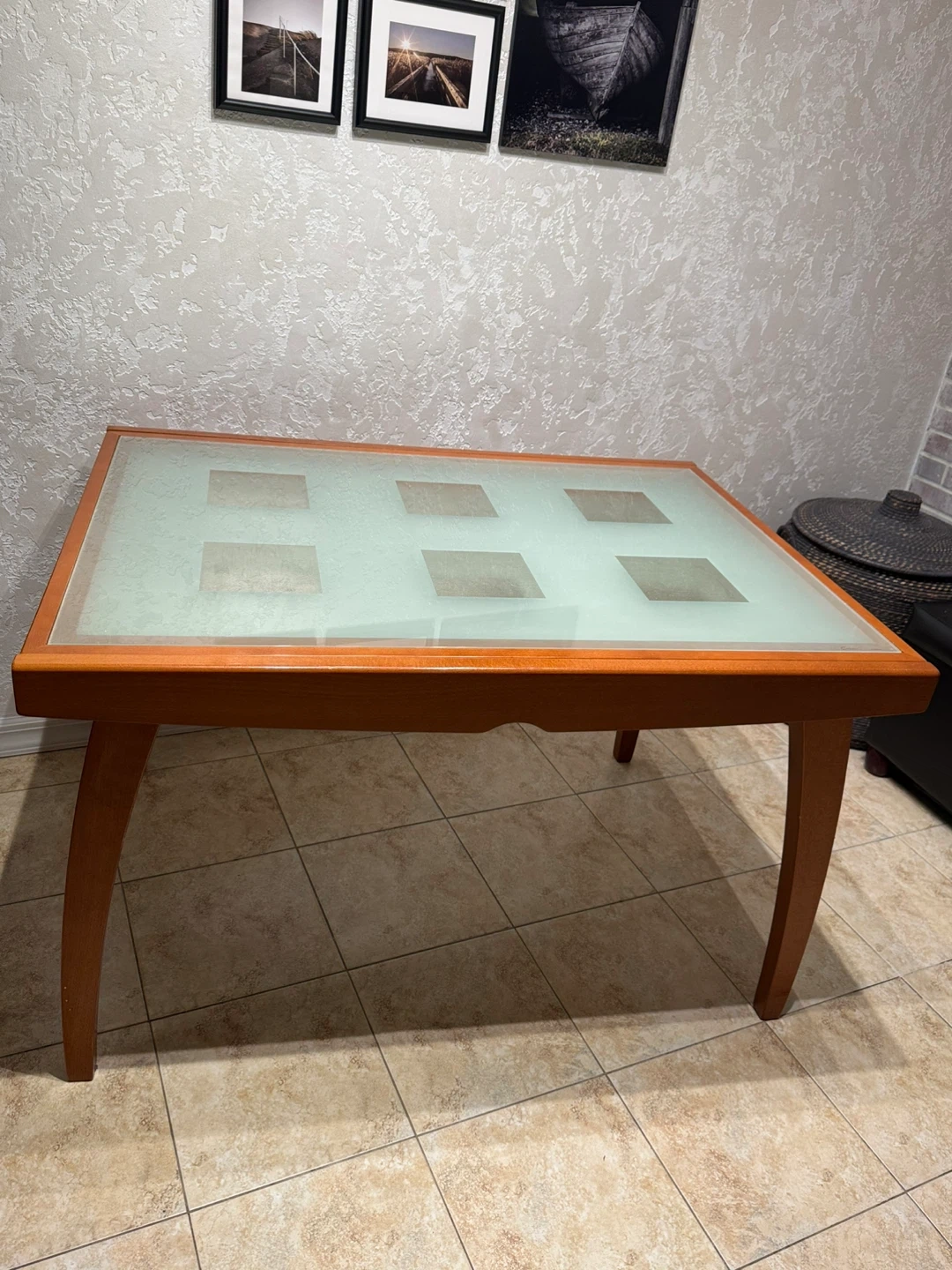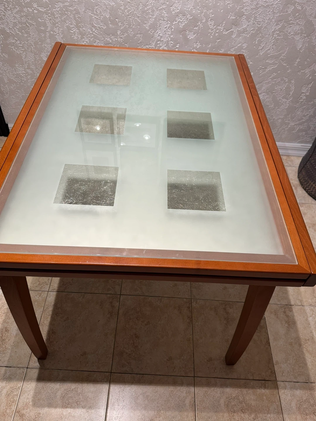 Selling a dining table made in Italy by Caligaris. It has a unique design with a glass top and a wooden frame. The table is in good condition and ready to be a great addition to your dining room!
