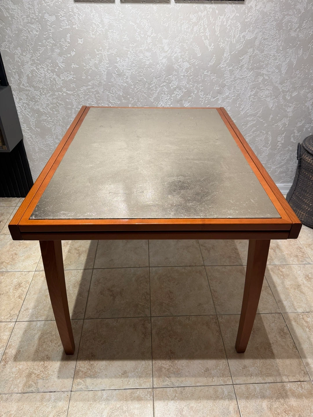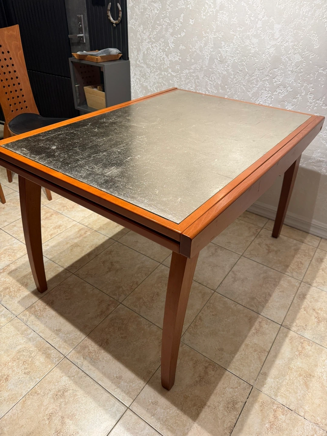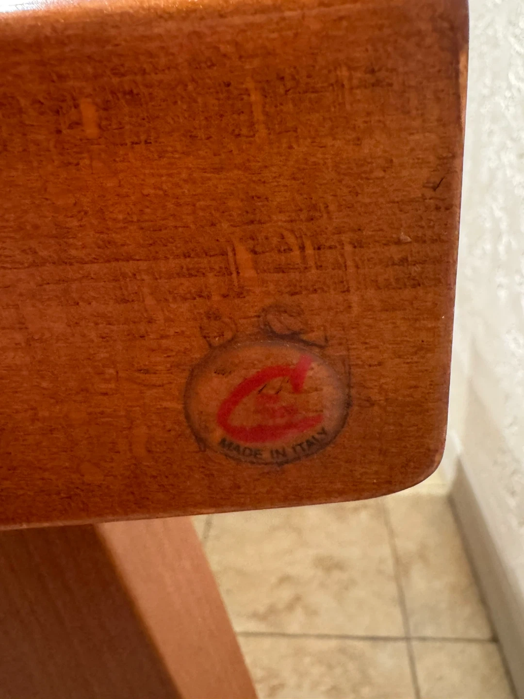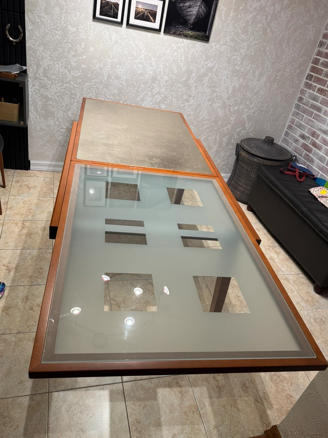 Selling a dining table made in Italy by Caligaris. It has a unique design with a glass top and a wooden frame. The table is in good condition and ready to be a great addition to your dining room!