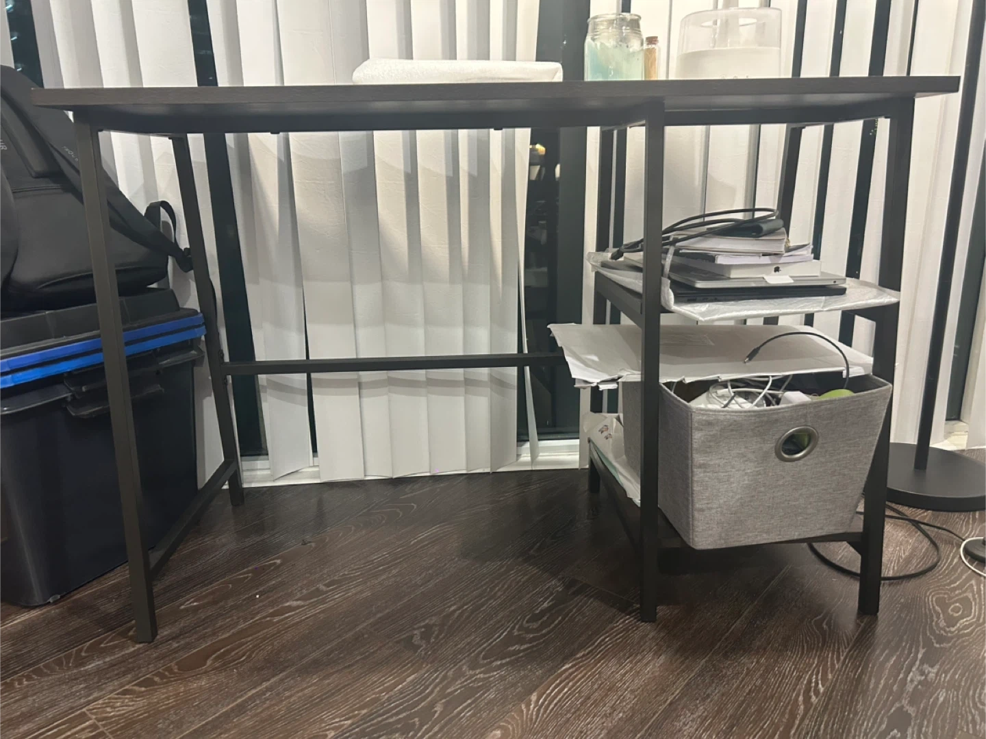 Selling a desk with a brown wood top and black metal frame. It has a shelf on the right side. Great for a home office or study space!