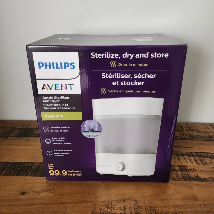 Selling a Philips Avent bottle sterilizer and dryer. It's in great condition and comes with the box. This premium sterilizer dries in minutes and sterilizes for 24 hours. It kills 99.9% of germs and is ready within 40 minutes. Great for keeping baby bottles clean and ready to use!