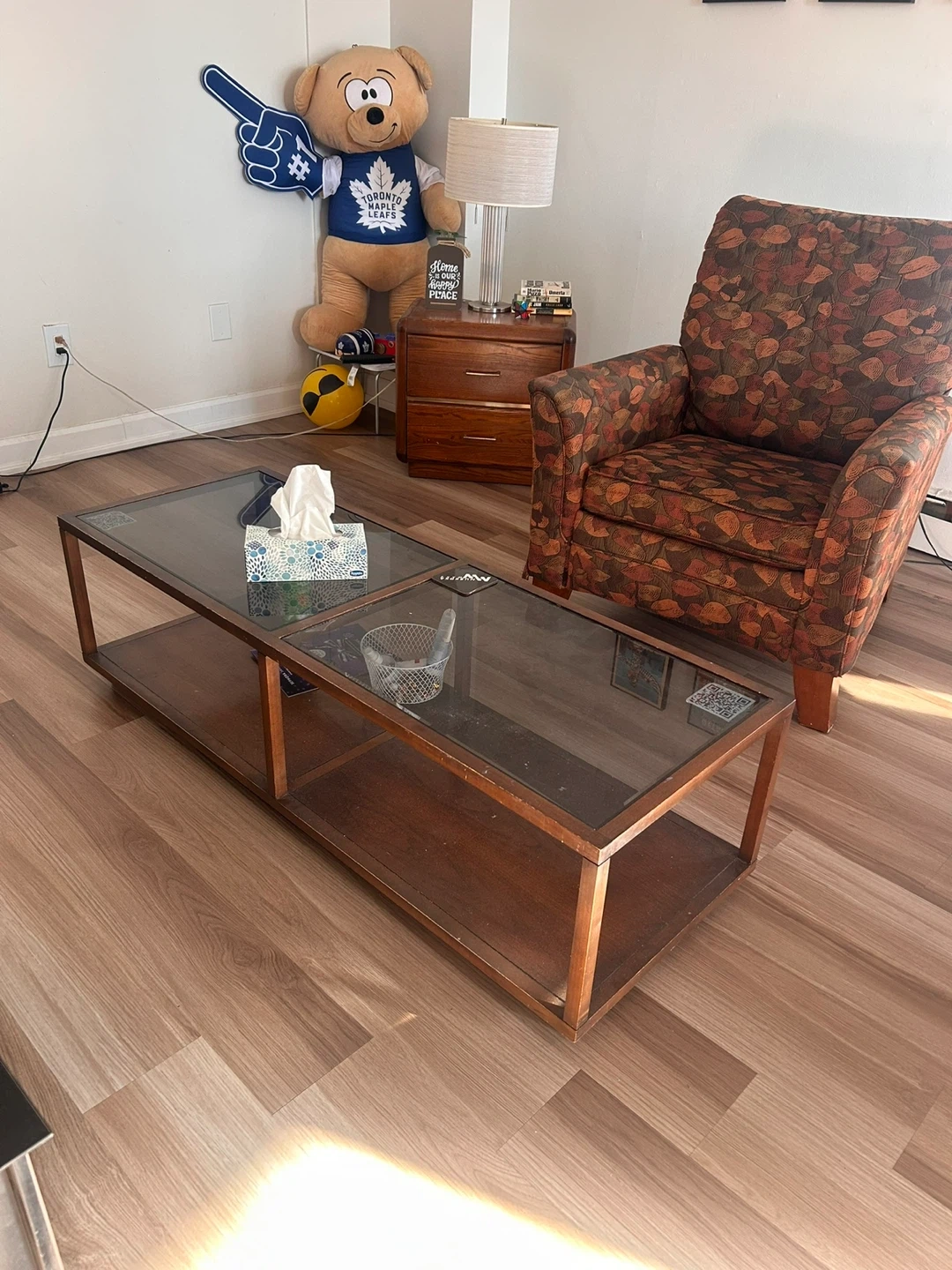Selling a coffee table with a glass top and a wooden frame. It has a bottom shelf for extra storage or decor. It's in good condition and would look great in any living room