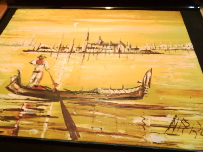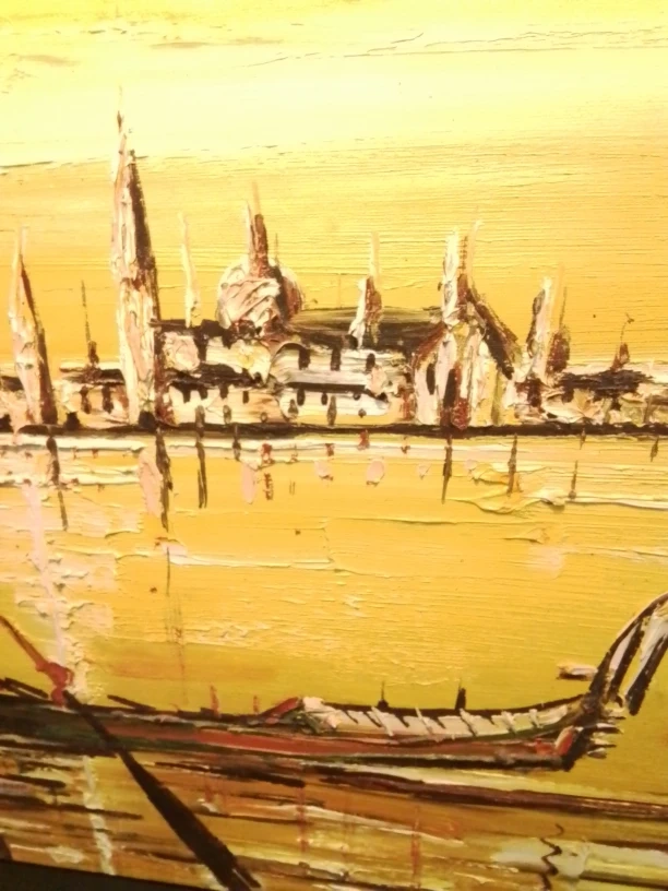 I'm offering a vintage MCM original oil painting, signed by the artist. This piece features a gondola scene, rich with texture and detail, showcasing a classic mid-century style. As a used item, it has a unique character that only time can give.