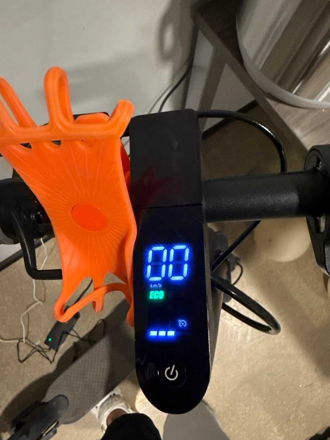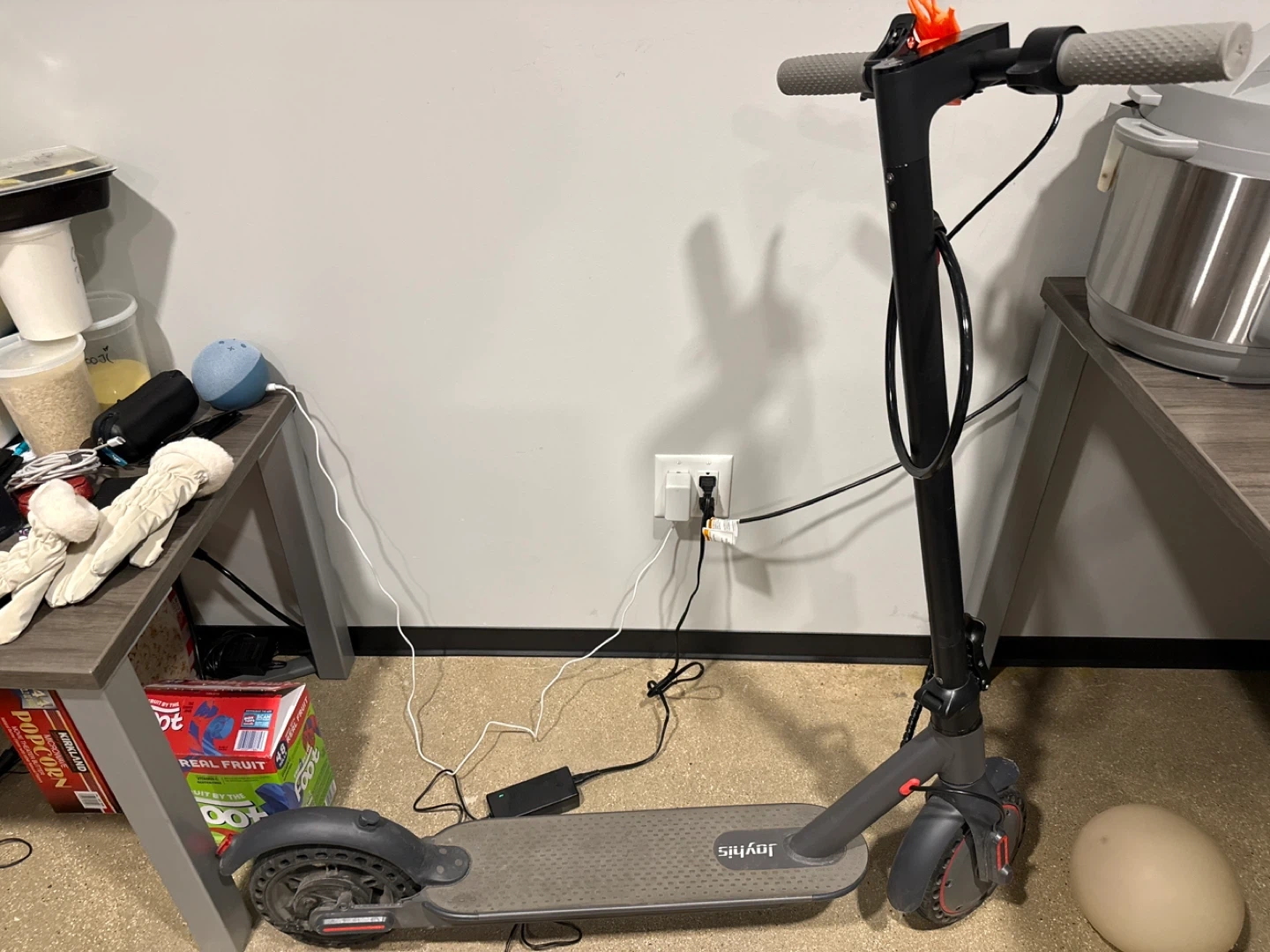 Selling a JoyHiis electric scooter! It's in good condition and ready for some fun rides. It has an orange phone holder attached to the handle. Perfect for getting around town!