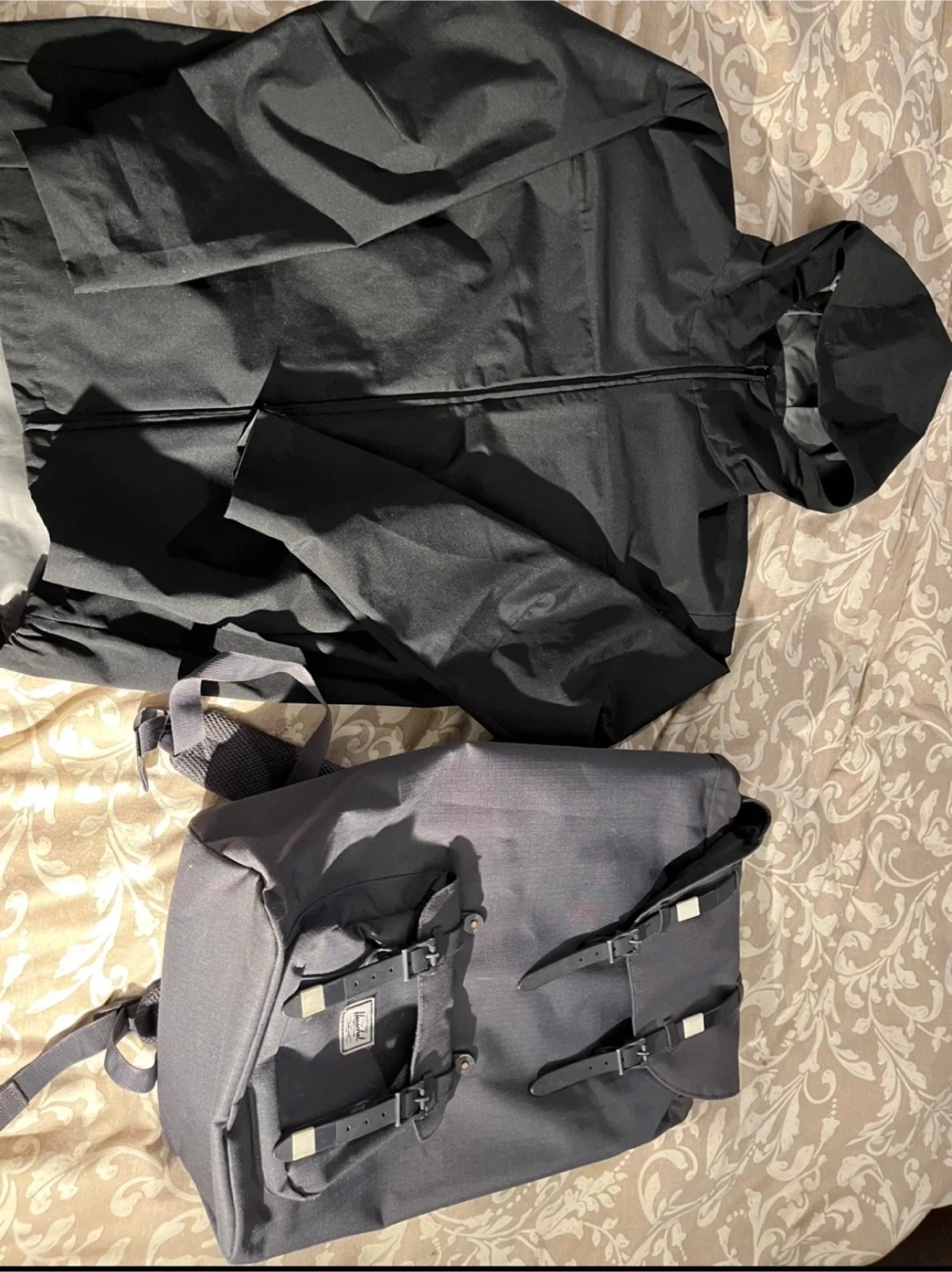 Herschel Backpack, Muji Black Jacket & Uniqlo grey jeans