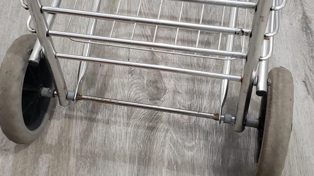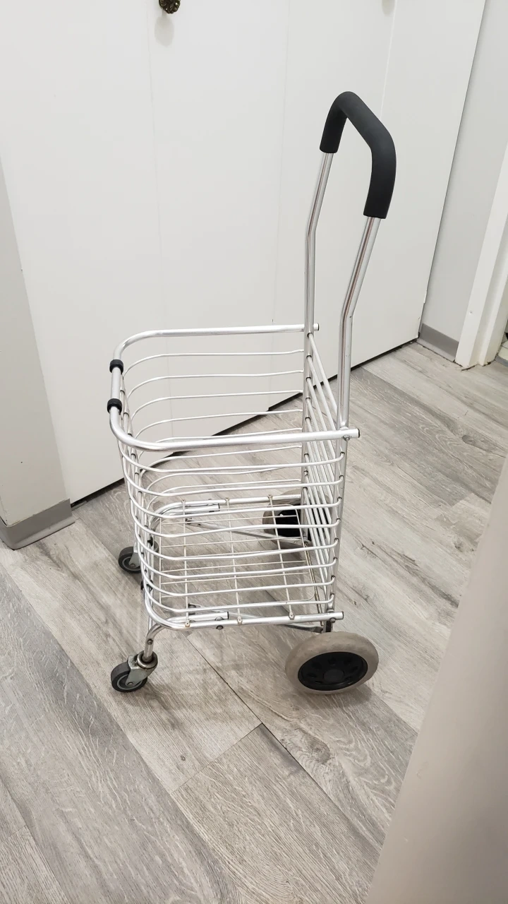 Lightweight, aluminum cart in great condition, large back wheels, swivel castor front wheels, folds up flat for storage, basket measures 12 inch X 12 inch wide X 15 inch tall, cart is 3 feet tall floor to handle. Works great and easy to take wherever you need to go! Make me an offer.