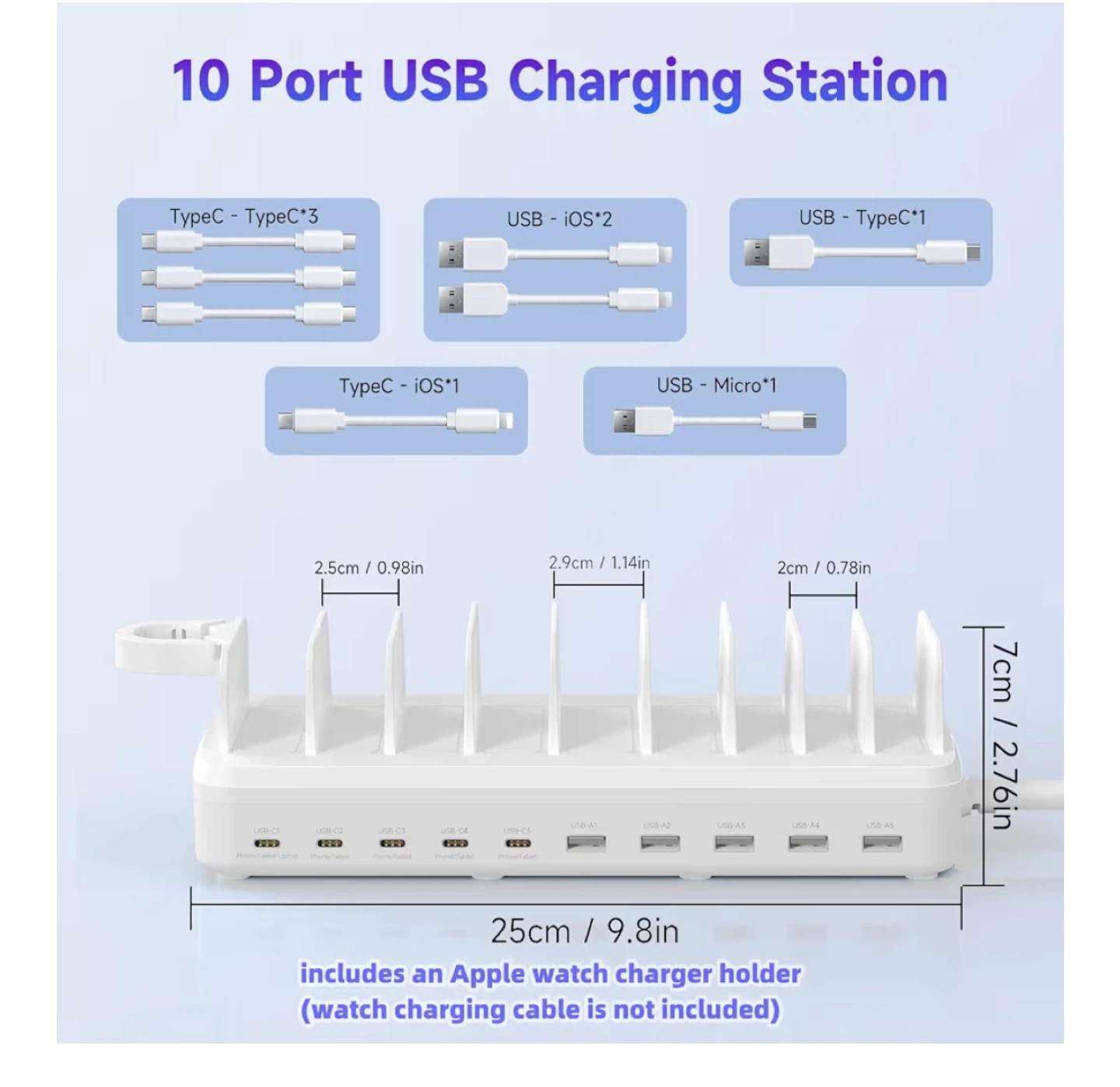 Selling a 285W 10-port fast charging station! It can charge multiple devices at once with its 1 x PD 65W + 4X PD 30W + 5X 20W ports. It includes an Apple watch charger holder, but the watch charging cable is not included. The dimensions are 25cm / 9.8in in length and 7cm / 2.76in in height