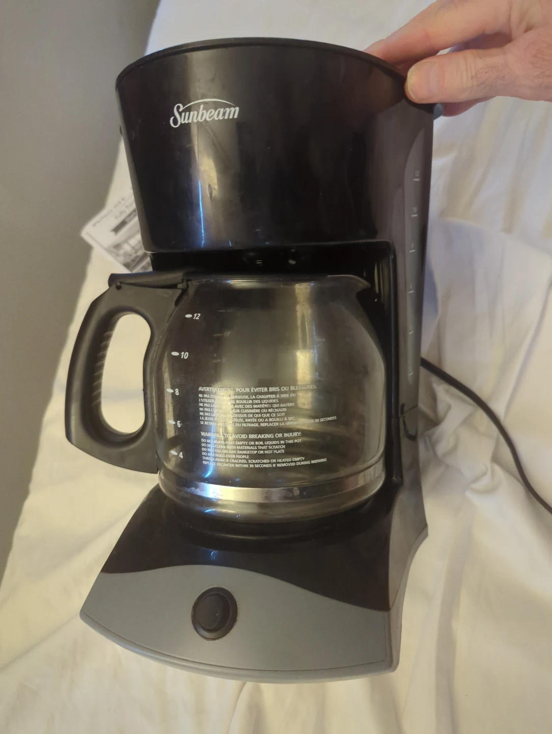 Selling a Sunbeam 12-Cup automatic Coffeemaker. It features a superior brewing system and is fully adjustable auto-on, auto-off, whatever cup settings of water put in with heater plate so you can enjoy on hot or let it cool to rewarm if you want later brewed coffee temperature you prefer! Included options possible : thermos / jugs / tea/coffee / mugs / cups , blenders , cooler/ BBQ, kitchen cookware , camping gear , hiking boots / runners , rain β & winter / sport recreation π£ , bikes ( free tuneups included with active sport & social membership FREE 1st year ) tools / accessories , personal training / sports & spinal rehabilitation for optimal care coaching Multidisciplinary Dr. Email your Smart π€ written goals for bonus gift consultation healthyselffit@gmail.com bonus if you Resolutions challenge gets thru soon , 1st come served