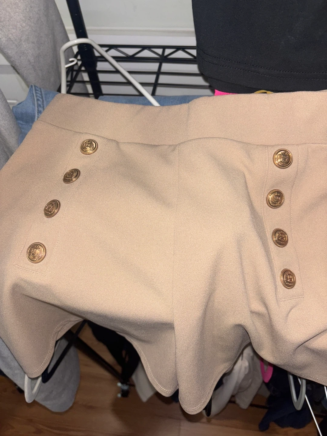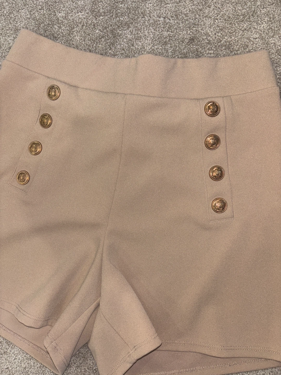 Here are some cute H&M women's shorts in a neutral beige color! They are a size medium and feature decorative gold buttons. Perfect for a stylish and comfortable look!