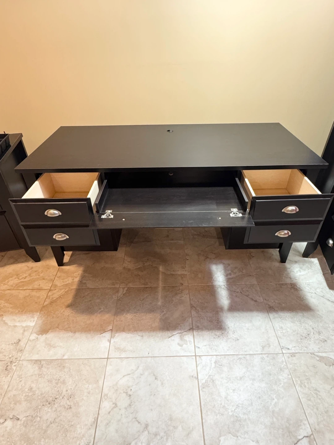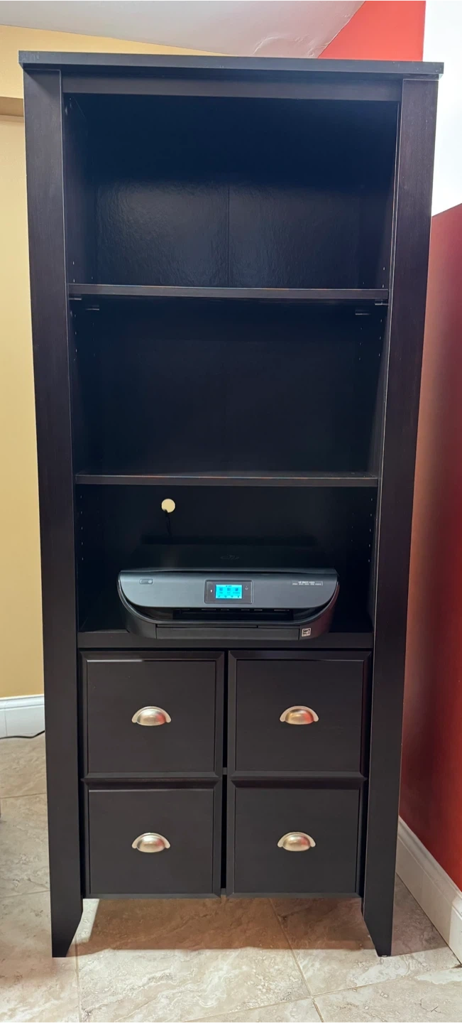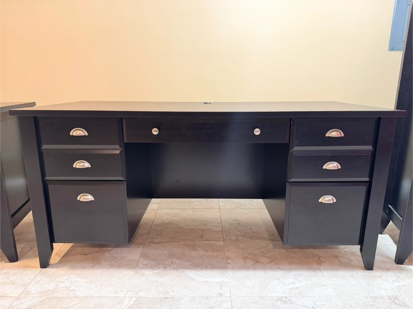 Selling a dark brown wooden desk, bookcase, and filing cabinet set. The desk has multiple drawers for storage, and the bookcase also includes drawers at the bottom. It's a great set for a home office or study area