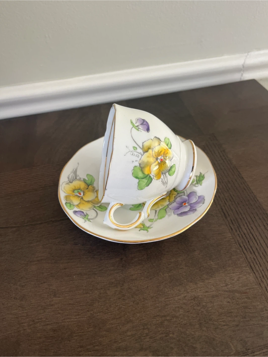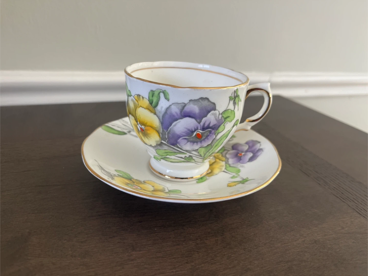 Selling a beautiful Salisbury fine bone china tea cup and saucer. The cup and saucer feature a lovely floral design with yellow and purple pansies and a gold trim. Perfect for adding a touch of elegance to your tea time!