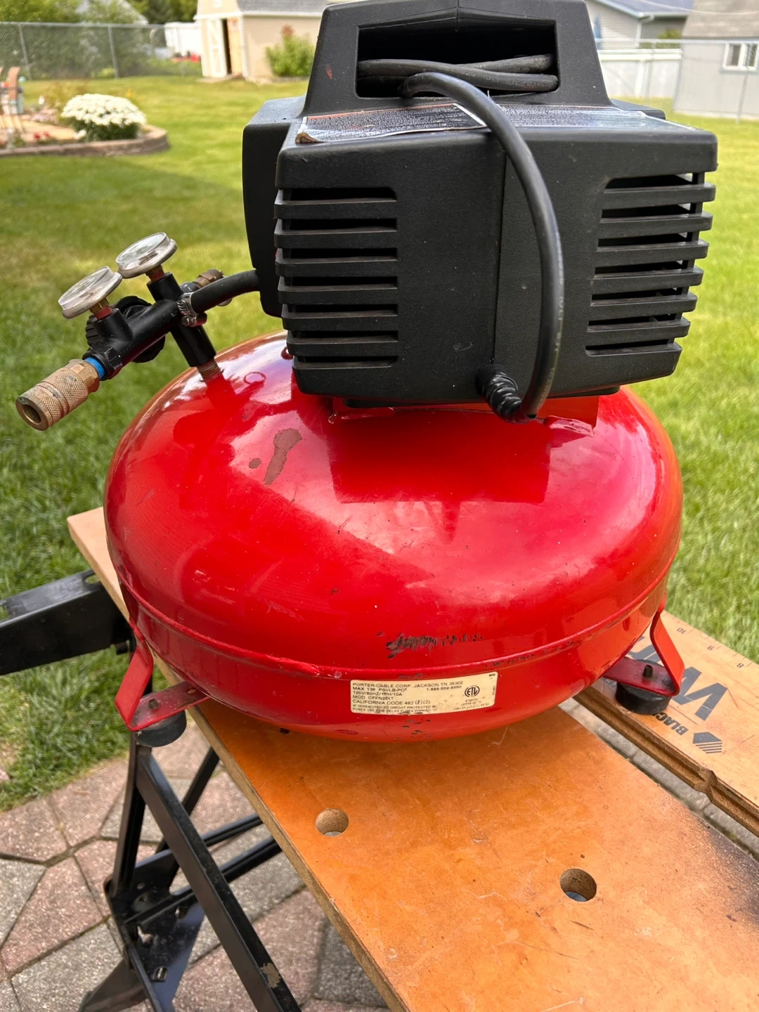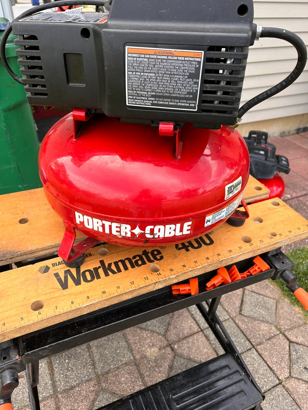Selling a Porter-Cable air compressor, 4.0 gallon capacity. It's oil-free and operates at 135 PSI. Perfect for small jobs around the house!