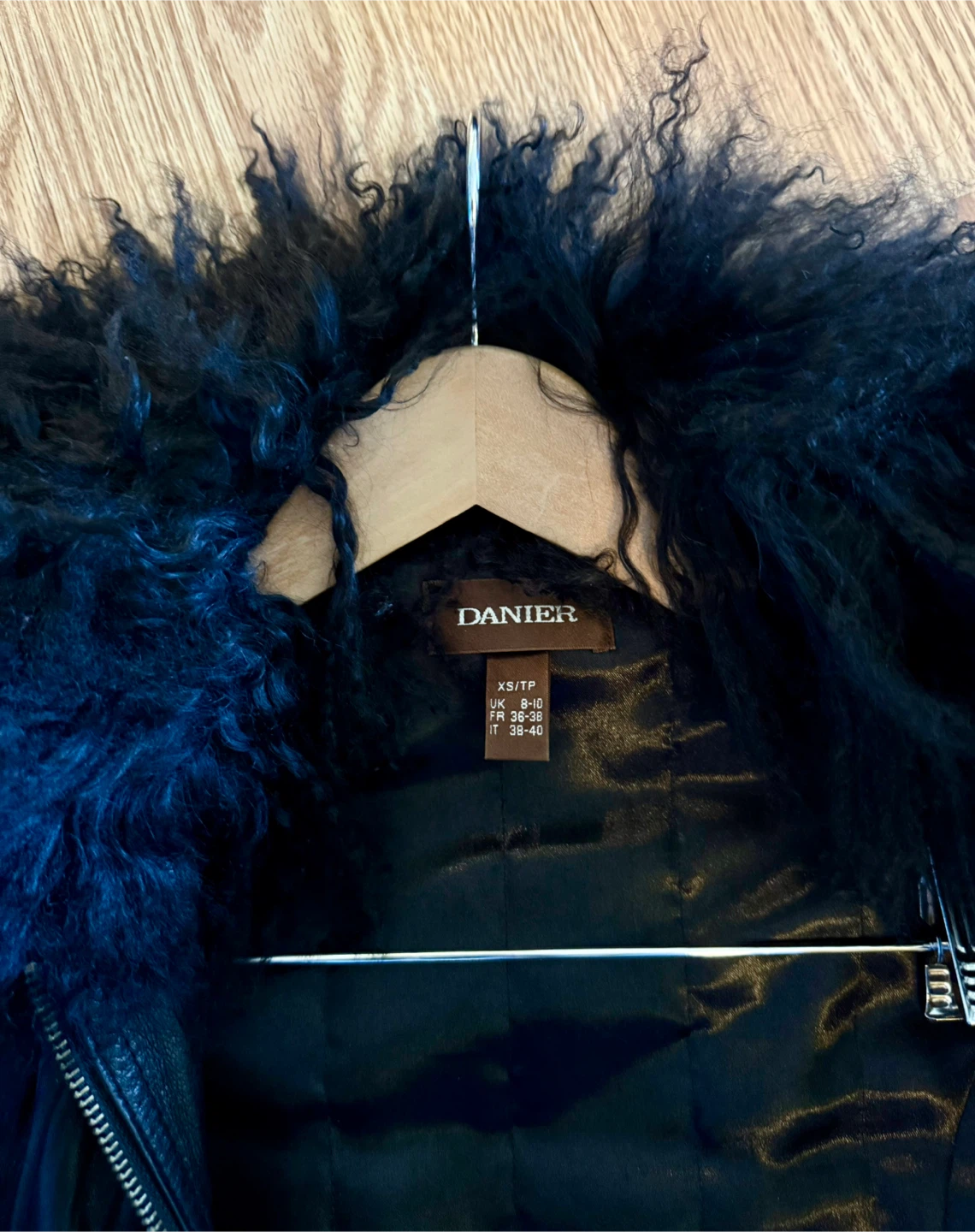 Selling a Danier black leather jacket in size XS/TP. It features a unique design with a fur collar and knitted cuffs. It's in great condition and perfect for adding a stylish touch to your wardrobe!