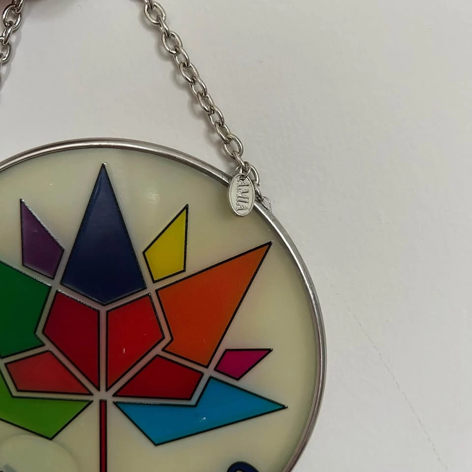 Beautiful Canada 150 collectible medallion with a vibrant stained-glass style maple leaf design. A commemorative piece created for Canada’s 150th anniversary, framed in metal and complete with a display chain. Great for collectors of Canadian memorabilia or as a unique decorative accent.