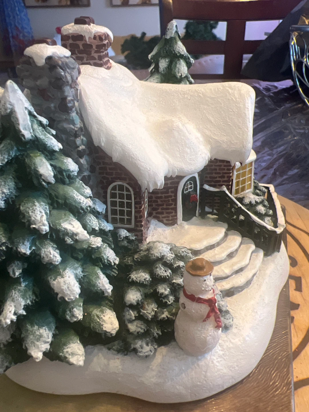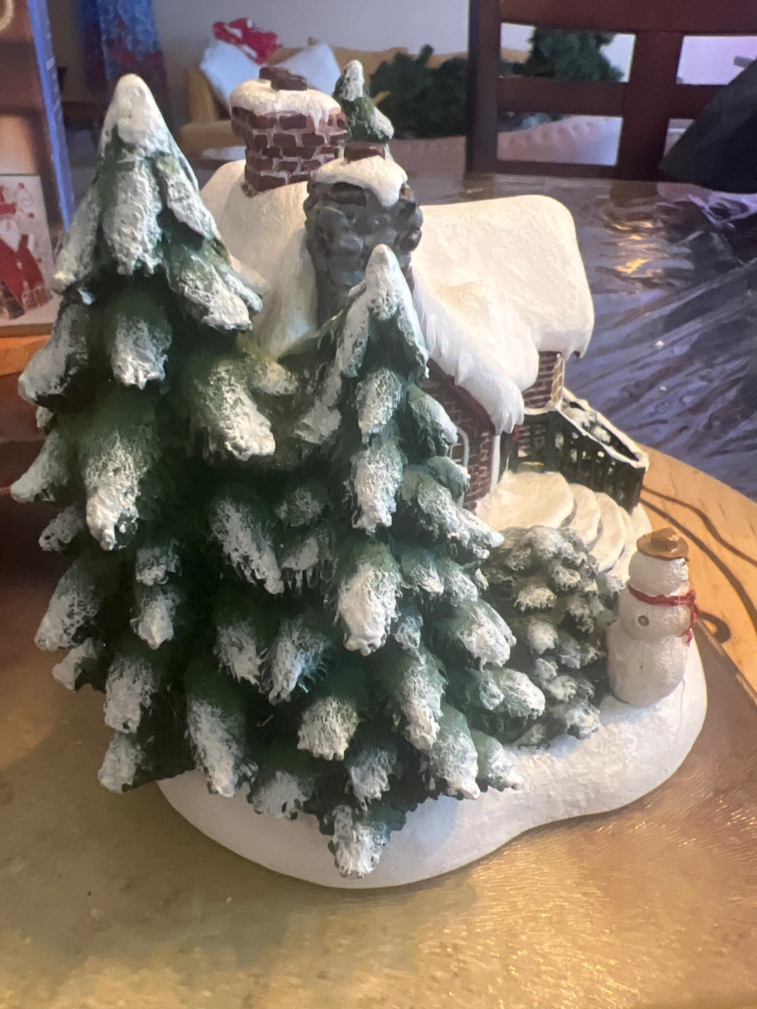 A charming Christmas village house figurine, perfect for adding a touch of winter wonderland to your home decor! This delightful piece features a snow-covered house, complete with miniature trees and a cute little snowman. It's in great condition and ready to bring some festive cheer to your space