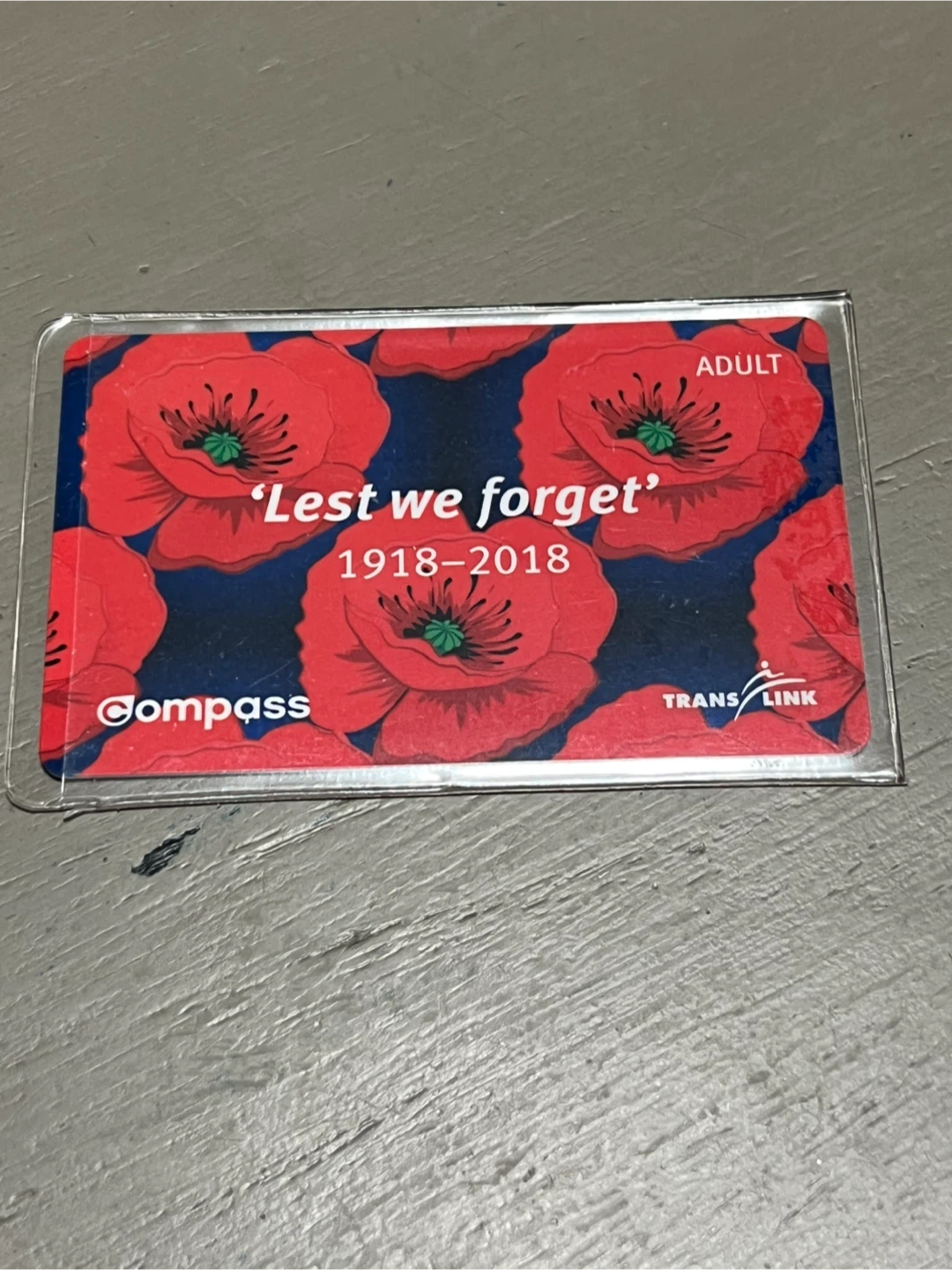 Compass Adult Transit Card with a poppy design, commemorating 'Lest we forget' 1918-2018
