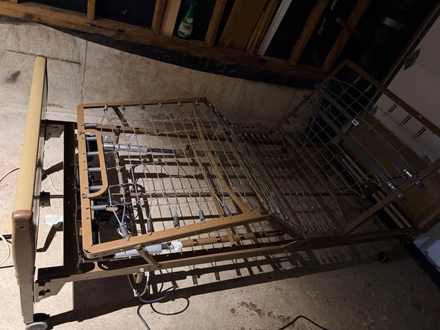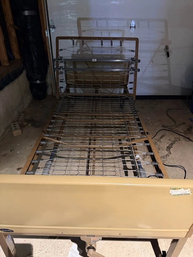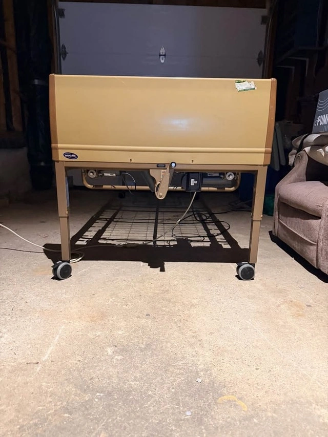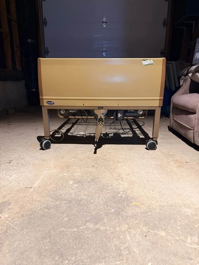 Invacare fully electrical Hospital Bed. Comes with full length padded rails for the patients safety and peace of mind to you. Asking $400. This bed is unique because It goes ALL the way to the ground to help prevent injuries and serious falls. (Not all hospital beds can do that). This bed is fully adjustable. It goes Way up/Way down, Incline to sit/Decline to lay, Foot elevation. Side rails can be full length of the bed (to keep anyone from falling out) or just at the feet. Your choice.