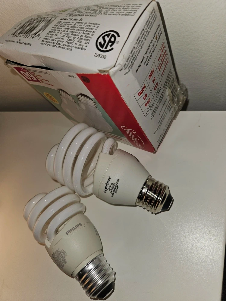Selling a pair of compact fluorescent light bulbs. One is a Luminus PC17723 and the other is a Philips mini twister compact energy saver lamp.