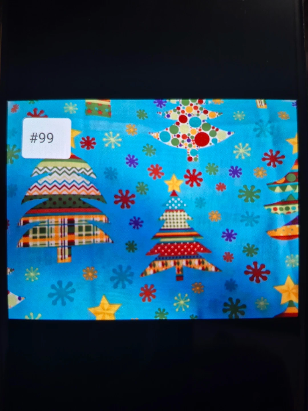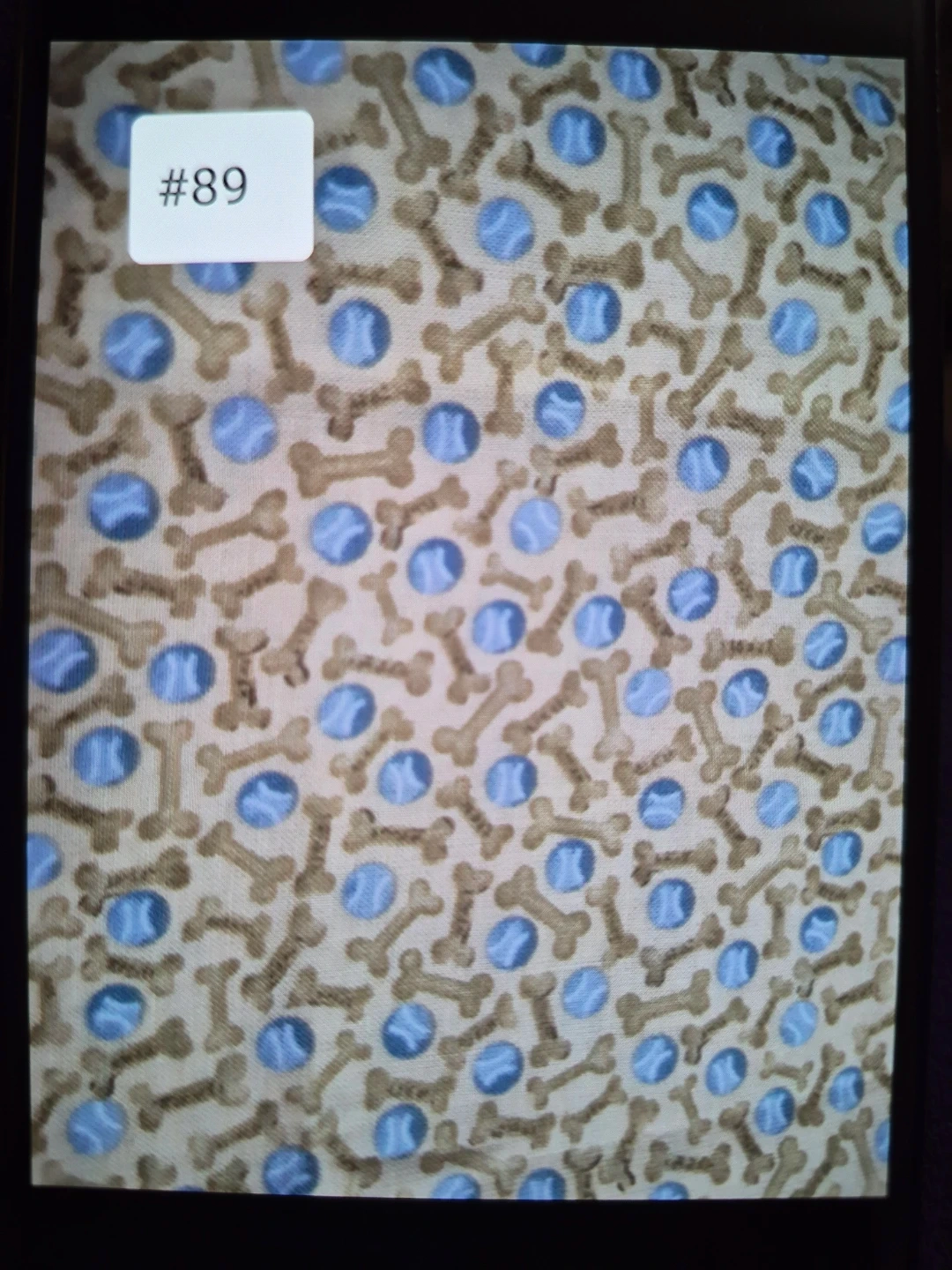 Here are some various pieces of patterned fabric. They have a variety of colours and designs, including Christmas trees, geometric patterns, flowers, and dog bones with blue balls. Great for crafting or quilting projects!