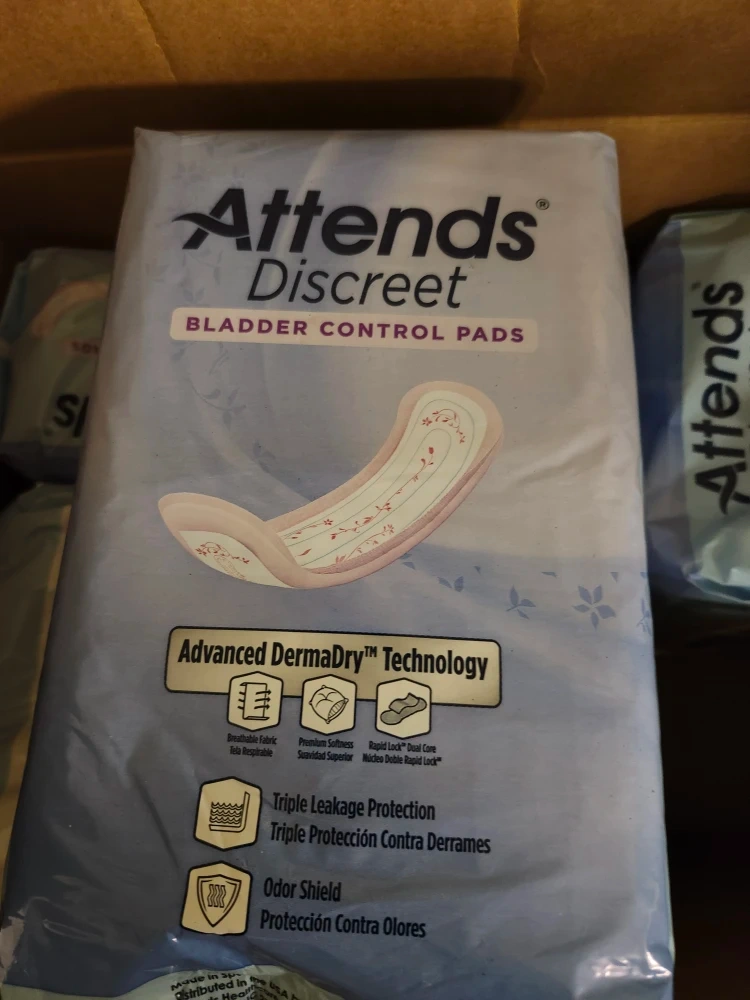 Selling Attends Discreet bladder control pads. They feature Advanced DermaDry Technology for breathable fabric and premium softness. Also includes rapid lock dual core, triple leakage protection, and odor shield