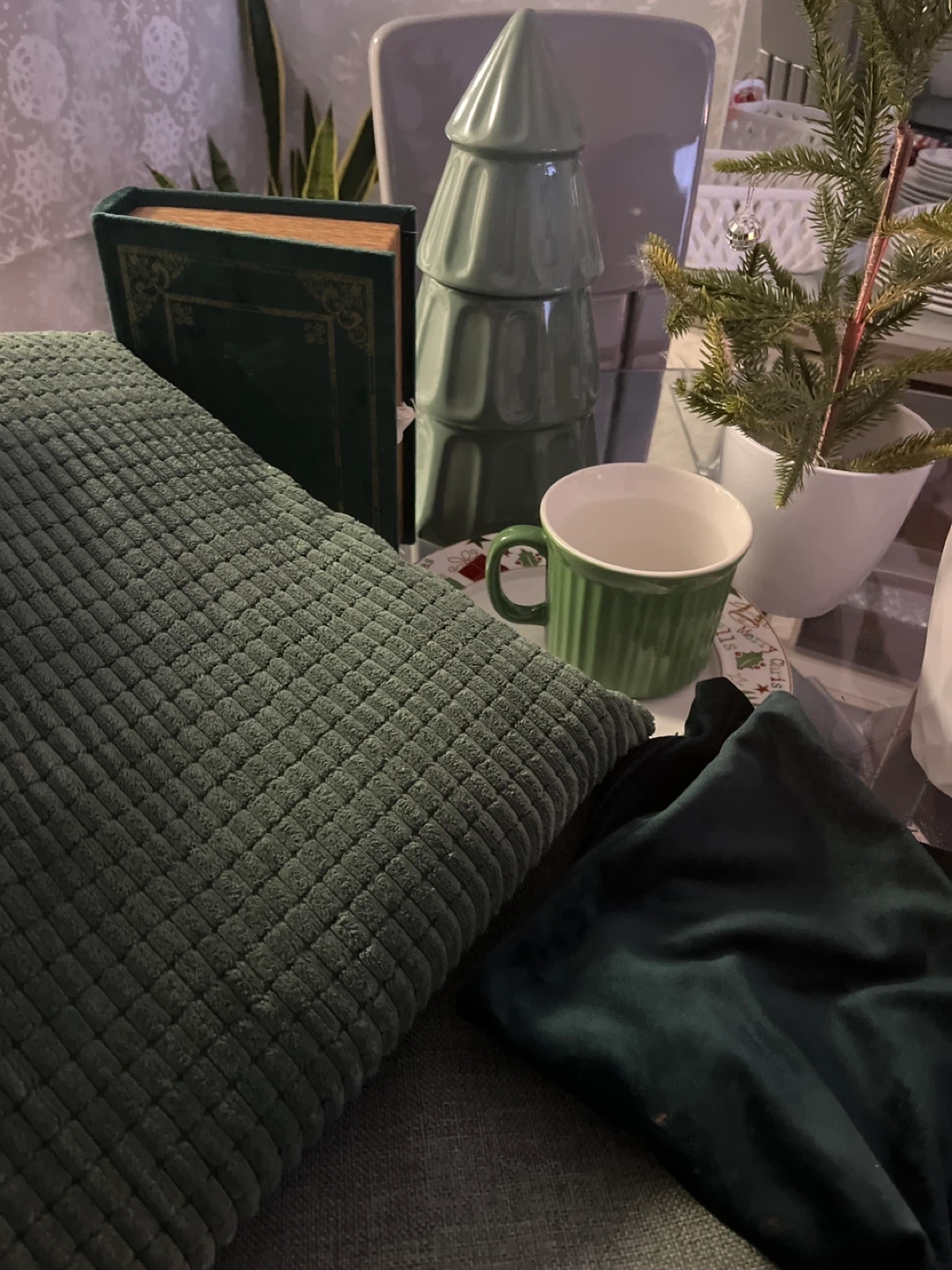 If you like the color green I am selling a green corduroy pillow , 1 dark green velvet pillow cover 18” x18”, 2 green linen 20” x 20” pillow covers, green Christmas tree cookie jar , a dark green velvet decorative box (book) 2 green and red Christmas plates w/ green mug.