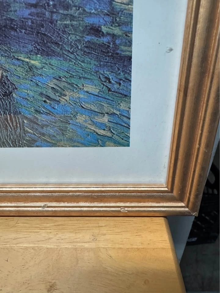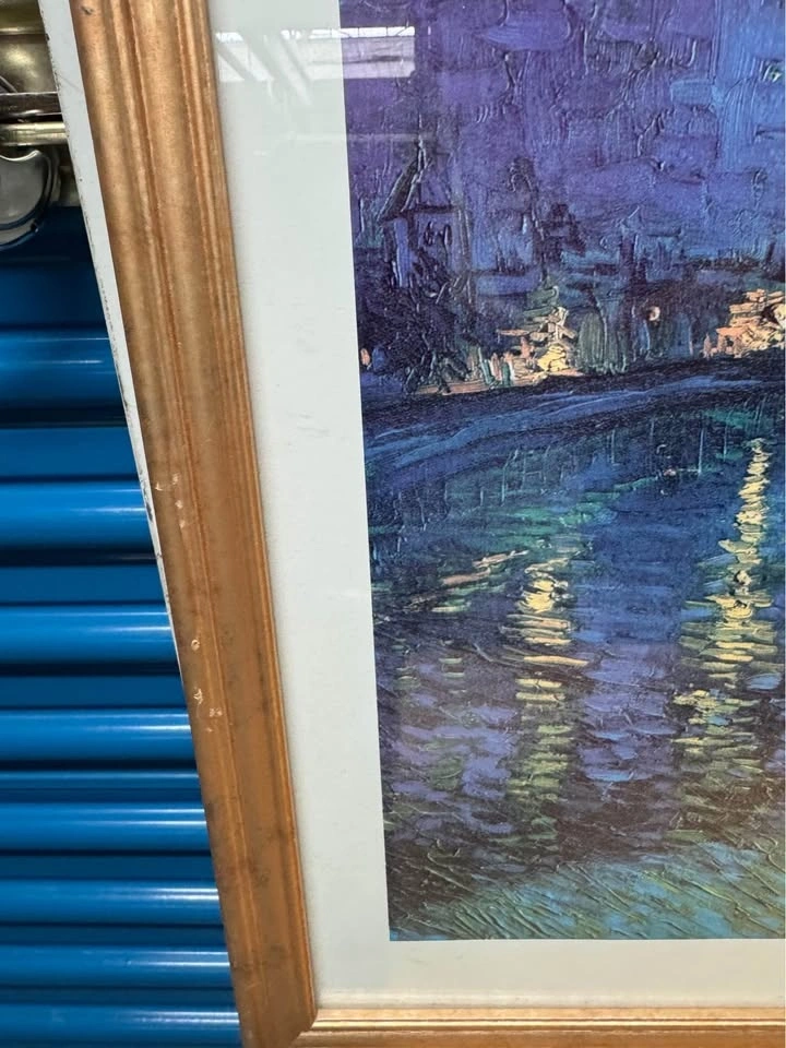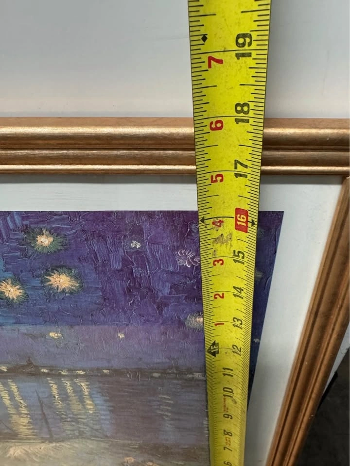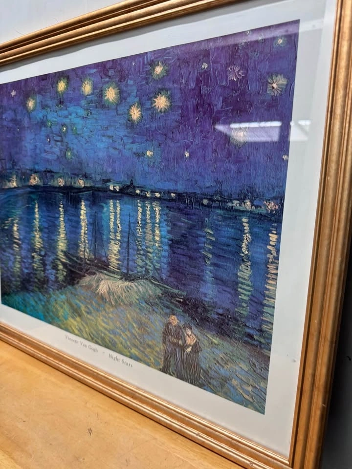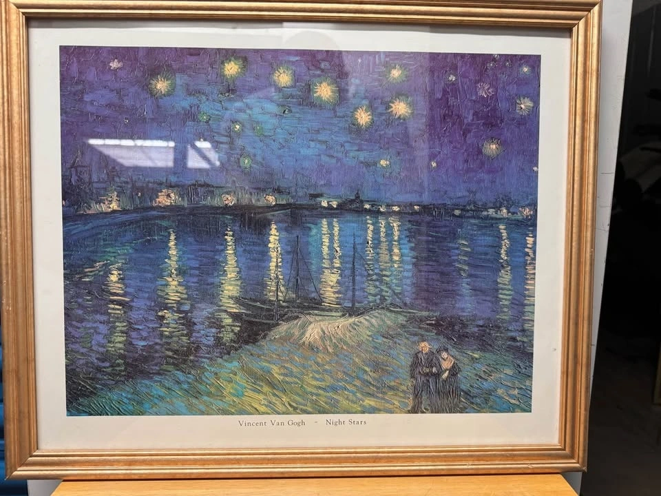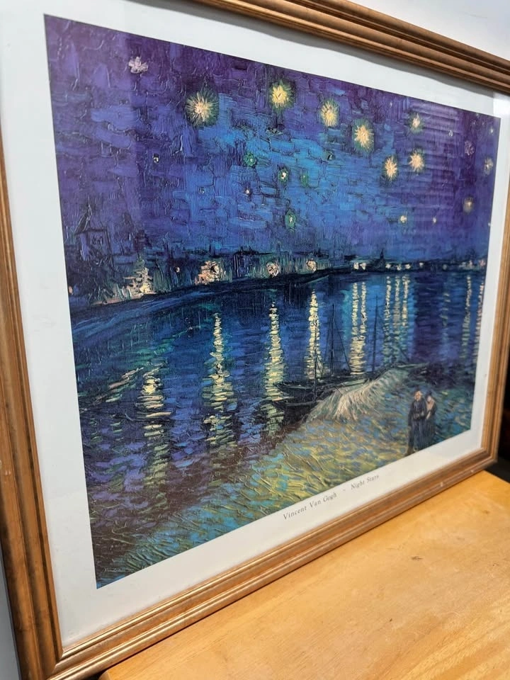 Beautiful framed art print of Vincent Van Gogh’s “Starry Night Over the Rhône.” Great colors, classic piece, and ready to hang. Frame is in decent shape with minor wear from storage. Dimensions: approx. 18” tall × 24–25” wide Condition: Good overall, clean backing, sawtooth hanger included. Perfect for living rooms, bedrooms, offices, or studio décor. Price: $35 Pickup: Near Austin & Grand in Chicago – cash only.