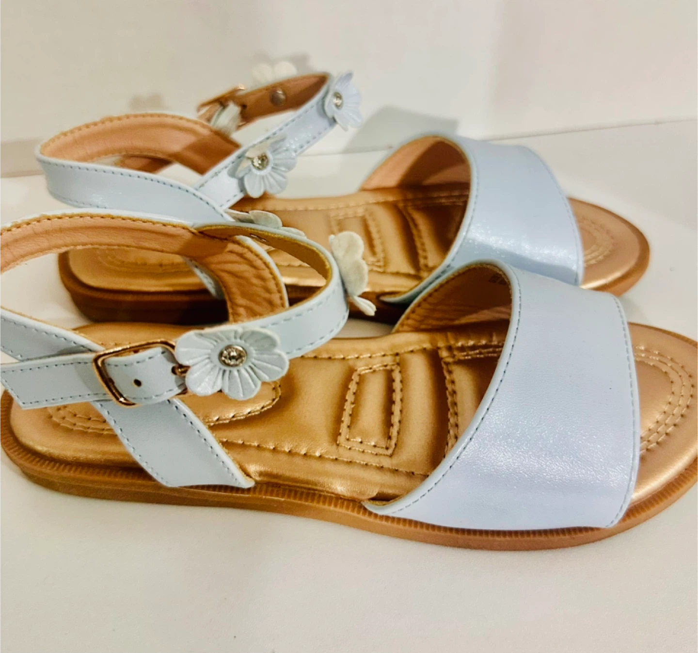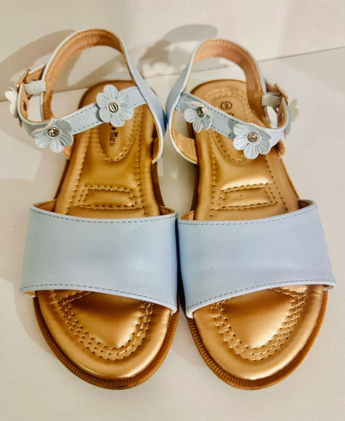 These adorable Gabby Marie sandals are perfect for your little one! They are a light blue color and feature cute flower embellishments. The size is 2.