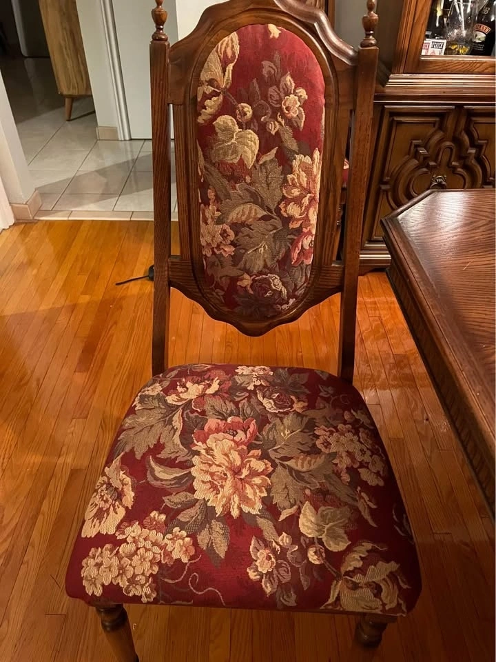 Comes with 6 chairs. 2 have arms. Chairs are in perfect condition. They can be easily reupholstered to match your living spaces.