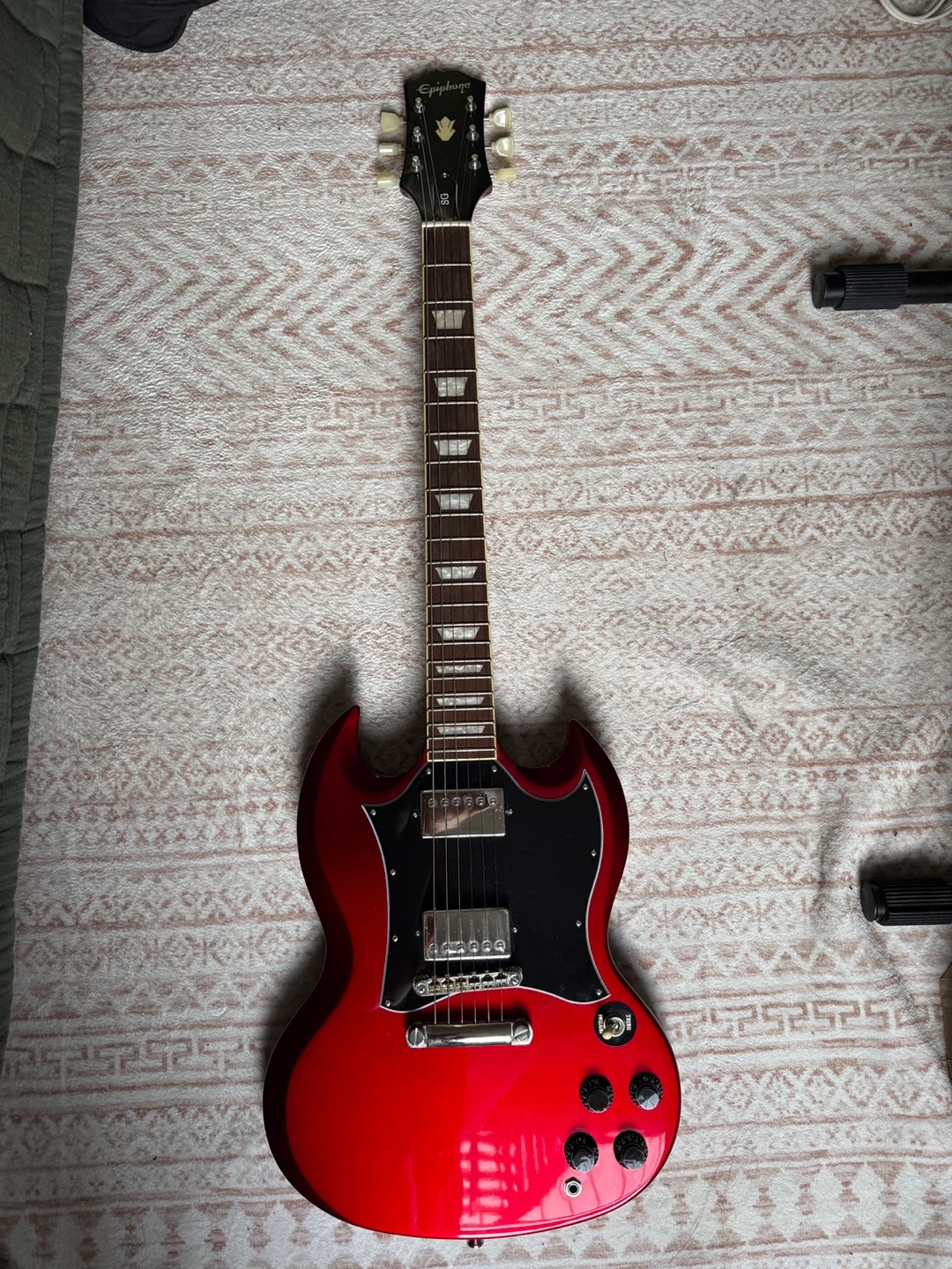 Selling a red Epiphone SG electric guitar! It's in good condition and ready to rock. Great for beginners or experienced players looking for a classic sound