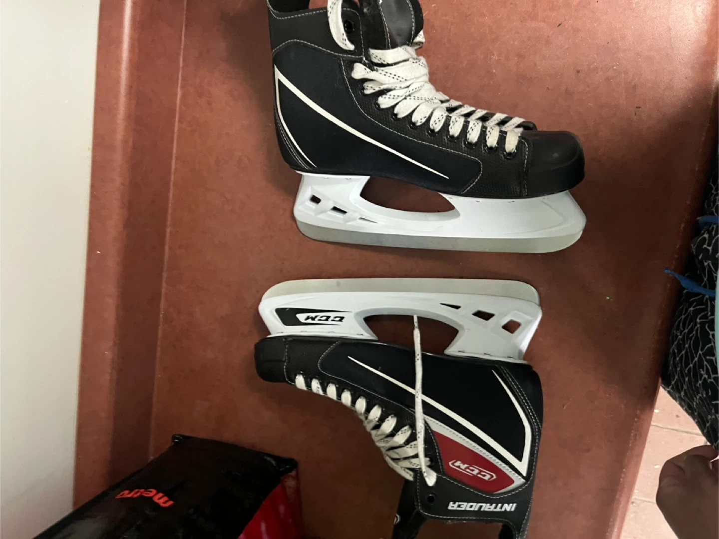 Selling a pair of CCM Intruder hockey skates in size 11. They're black and white and in good condition. Perfect for hitting the ice!