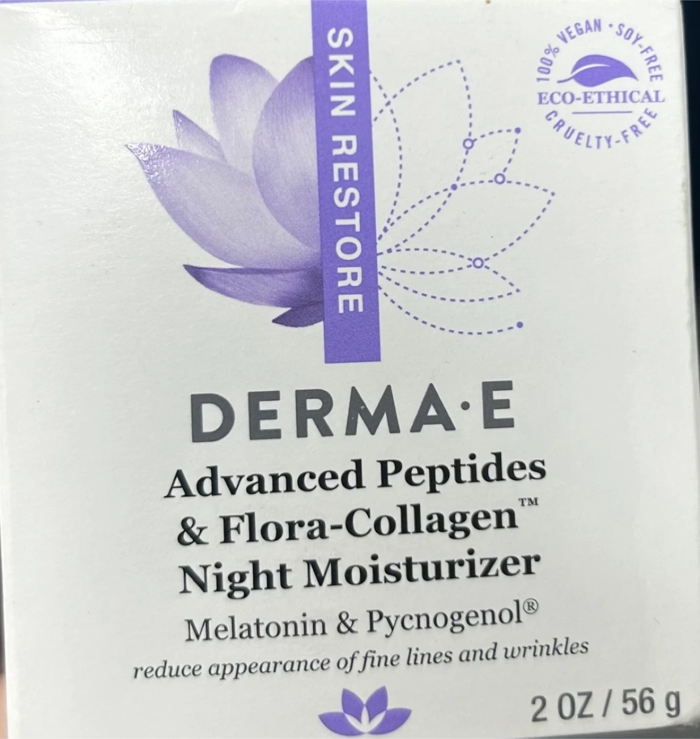 I'm selling a DERMA-E Advanced Peptides & Flora-Collagen Night Moisturizer. This moisturizer contains Melatonin & Pycnogenol and comes in a 2 oz / 56 g size. It's also 100% vegan, soy-free, and eco-ethical cruelty-free!