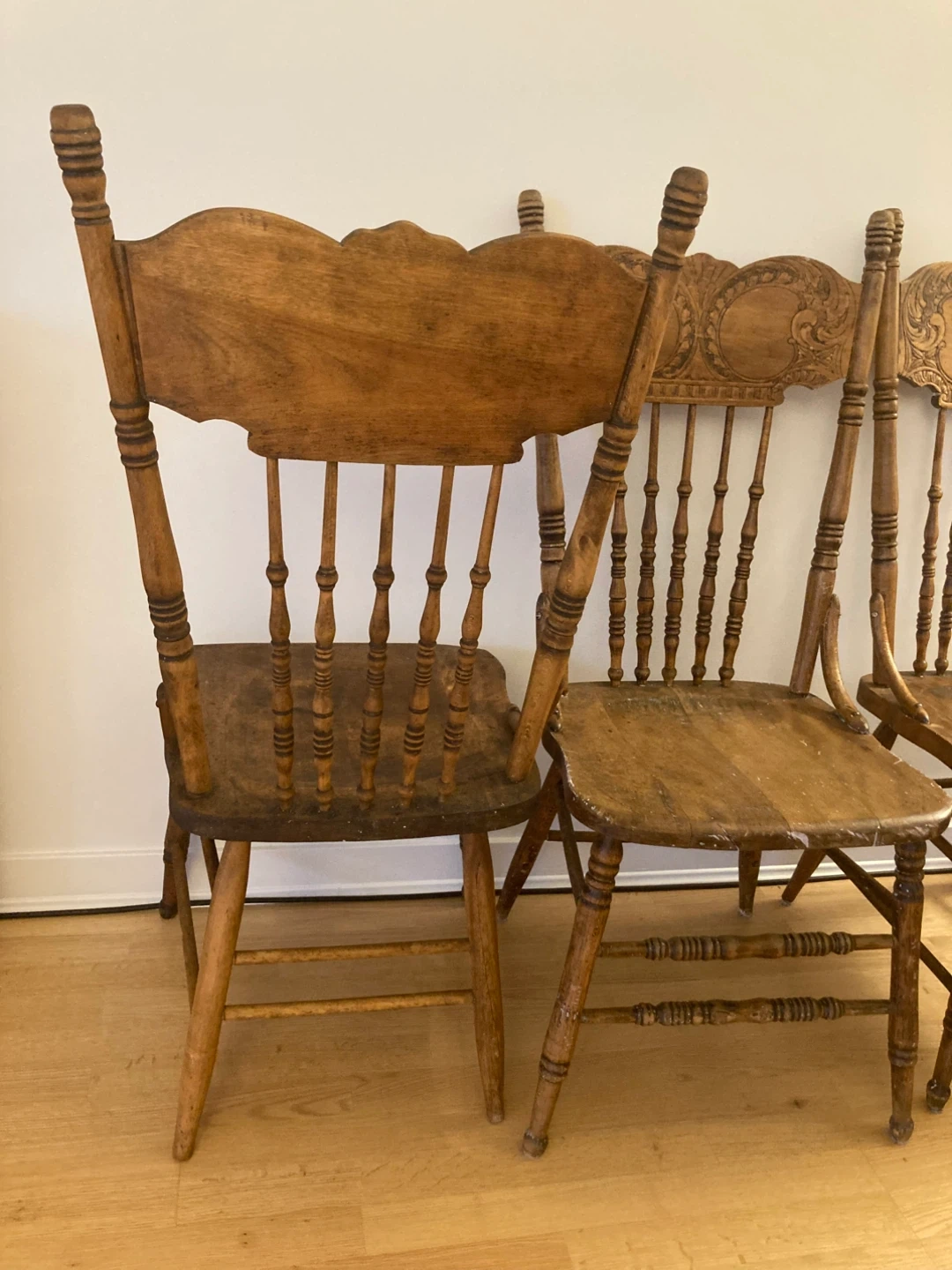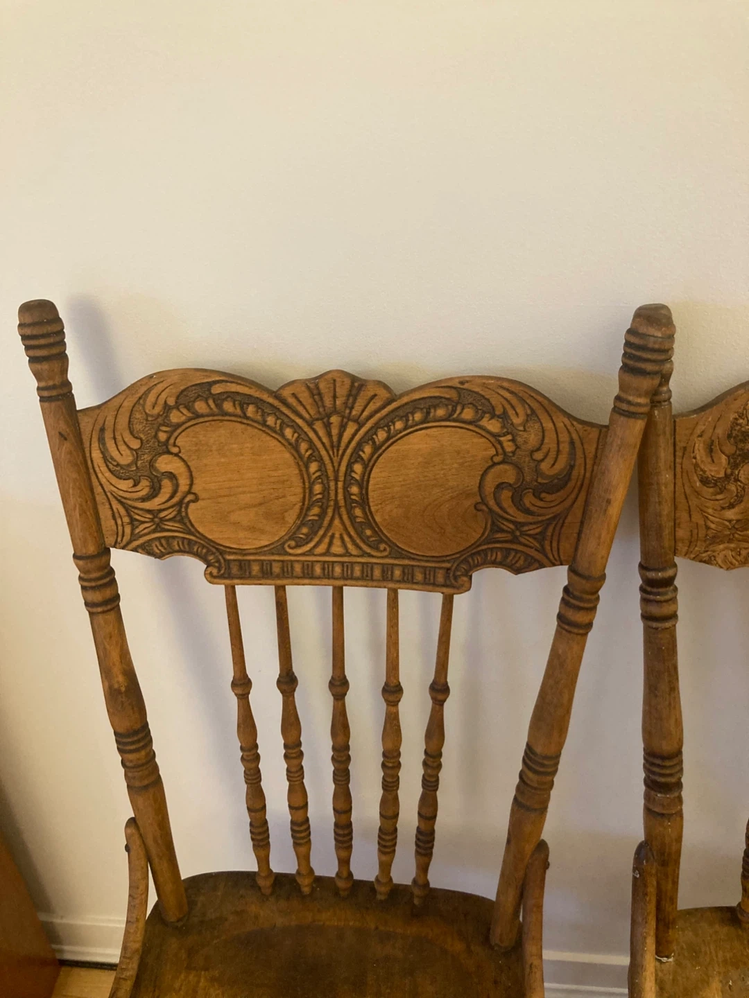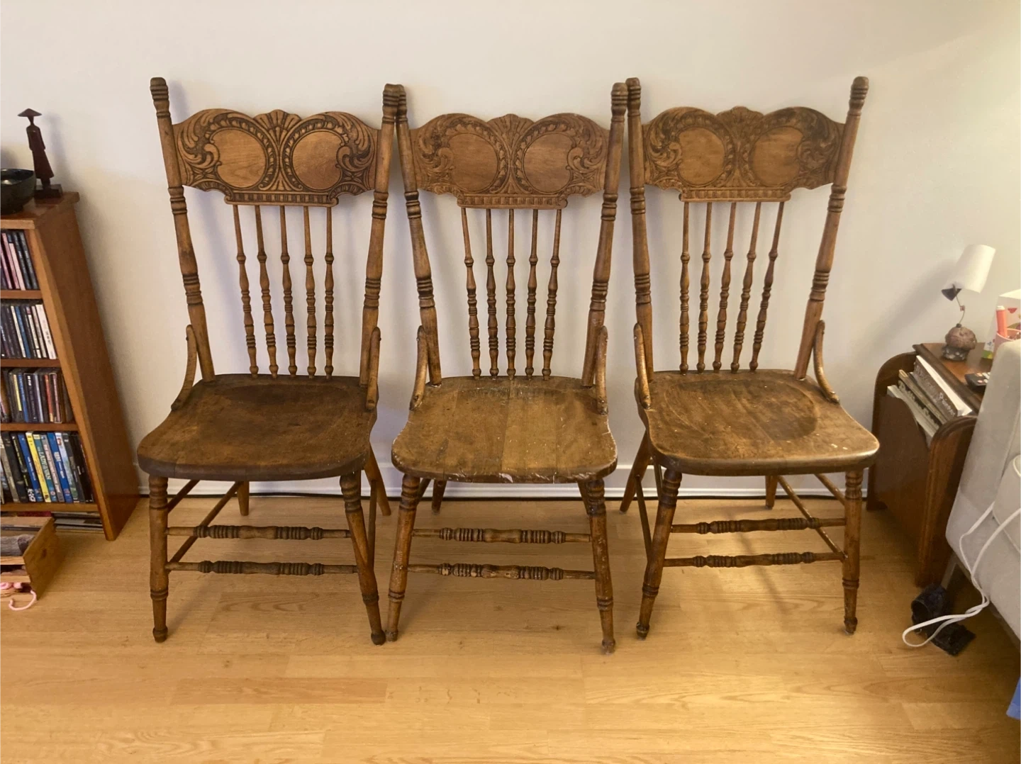 Selling a set of three antique wooden chairs from Newfoundland. They have unique carvings on the backrests and a classic design. Perfect for adding a vintage touch to your dining room or kitchen!