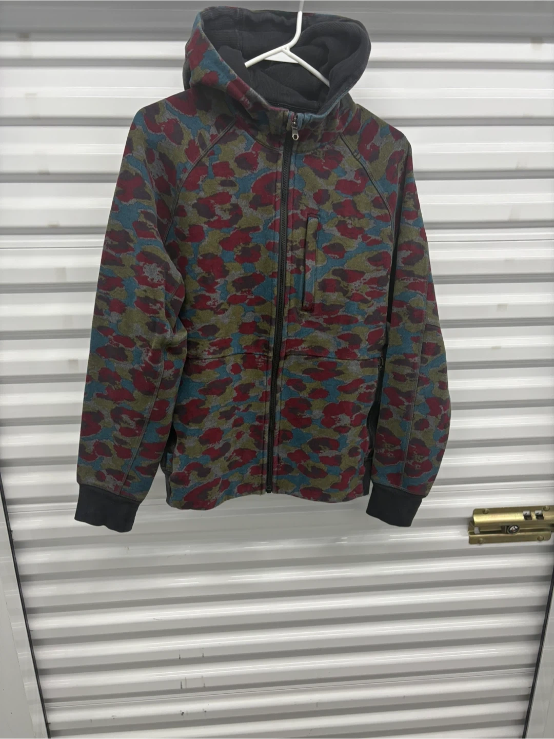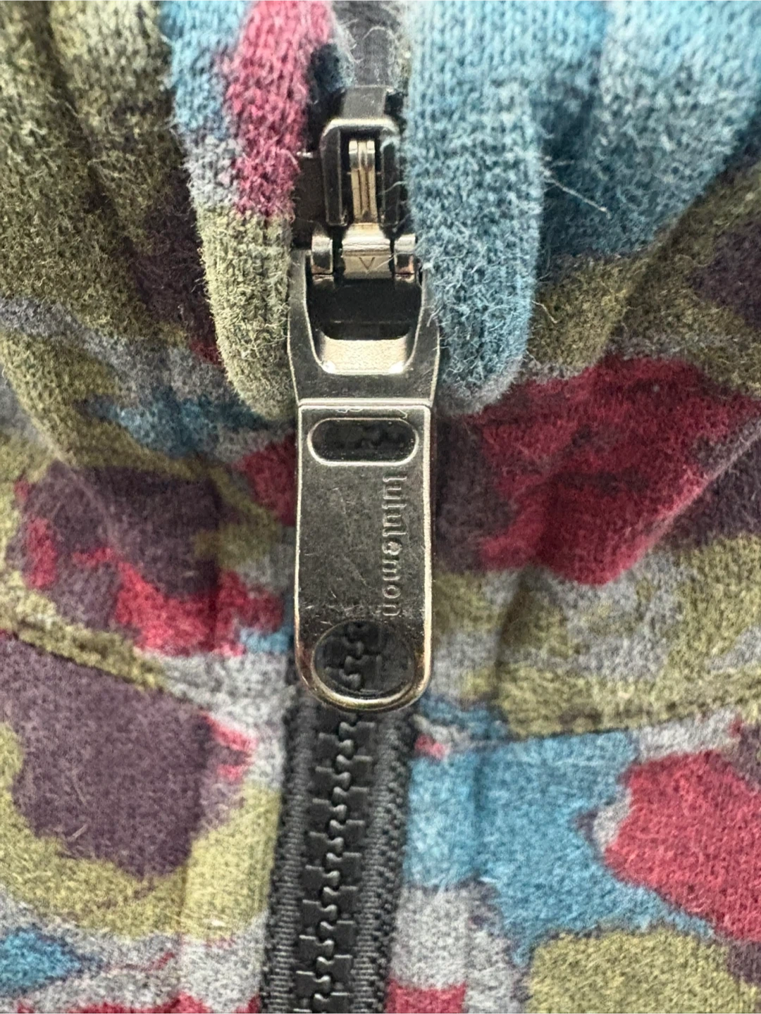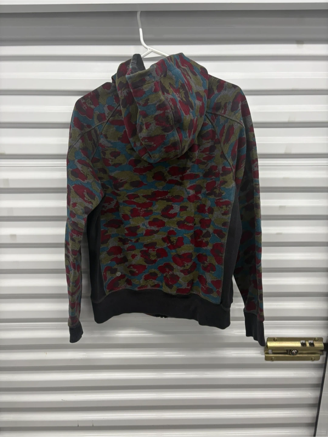 I'm selling a Lululemon full zip hoodie! It has a unique pattern with red, blue, and yellow. It's in great condition and ready for a new home. scuba model medium excellent condition