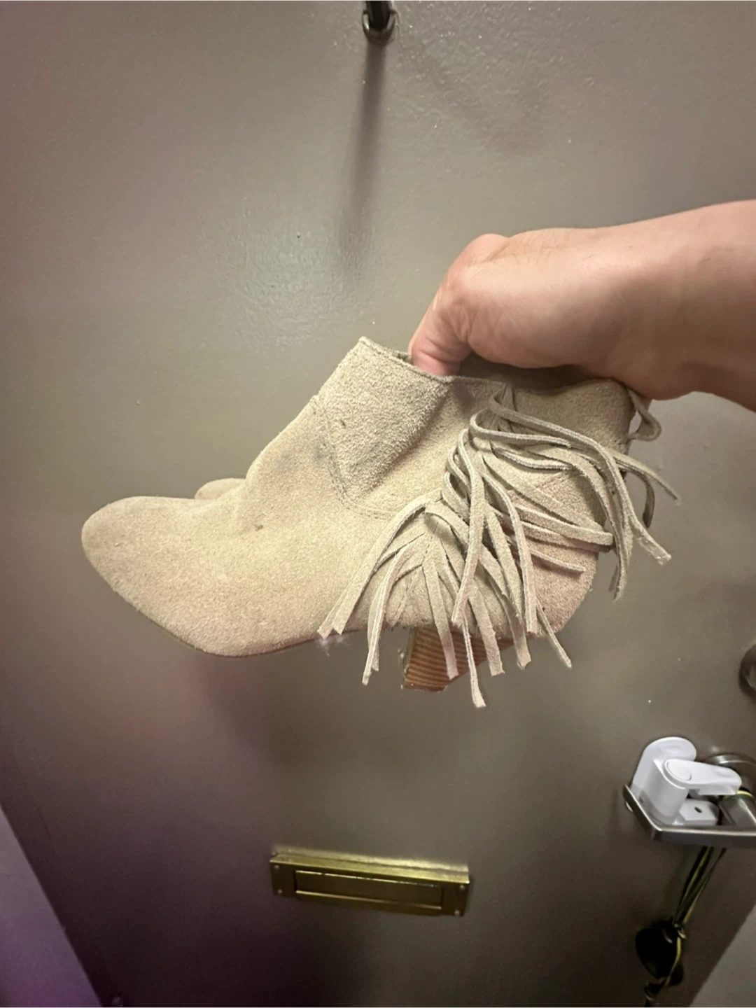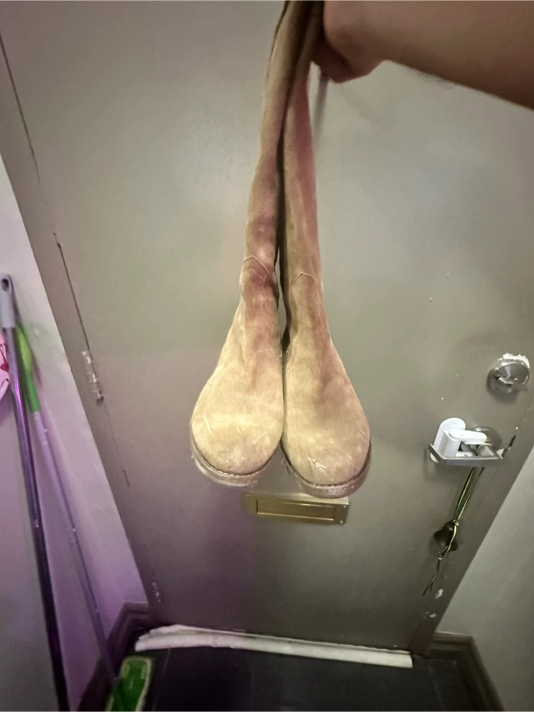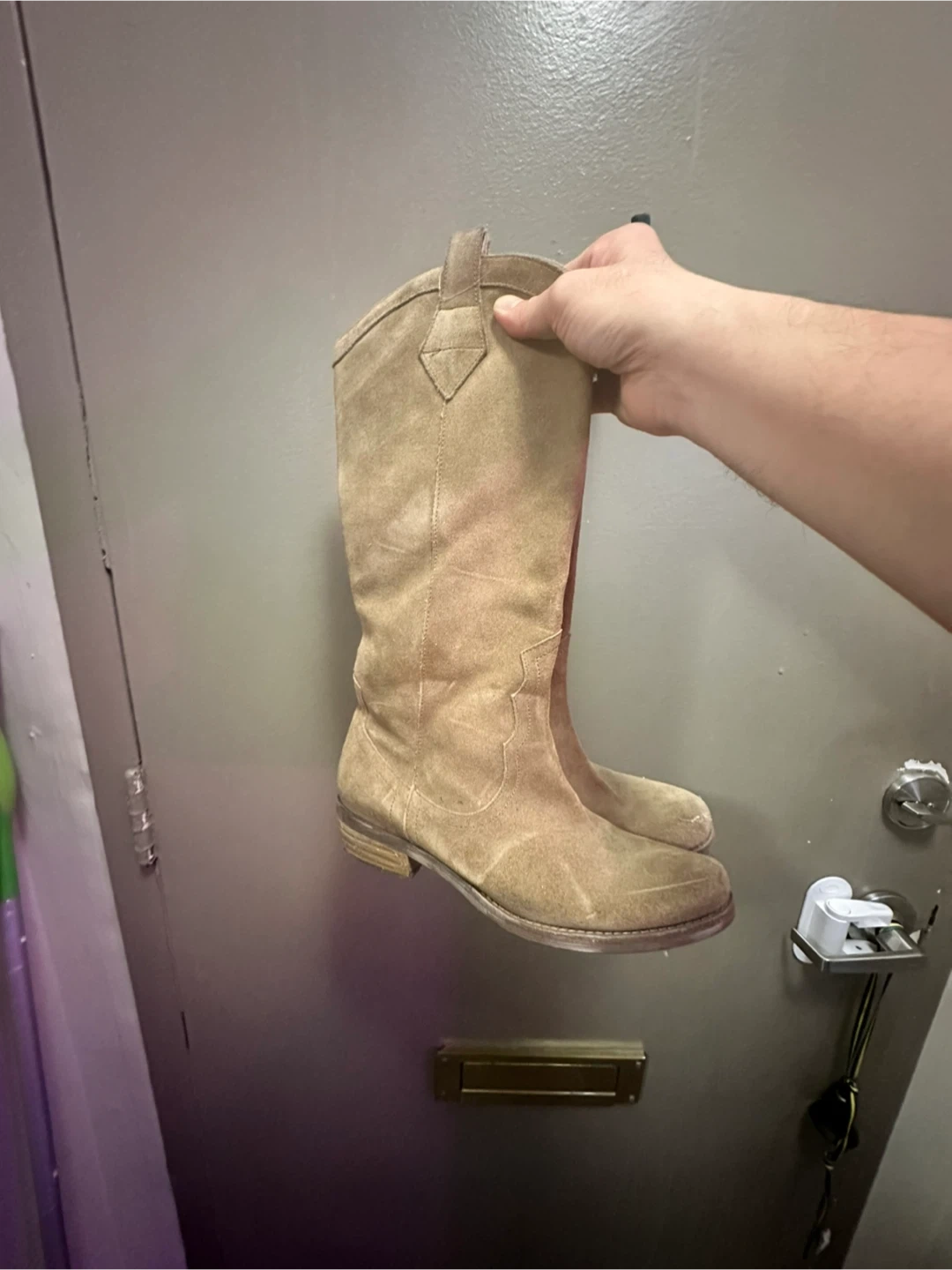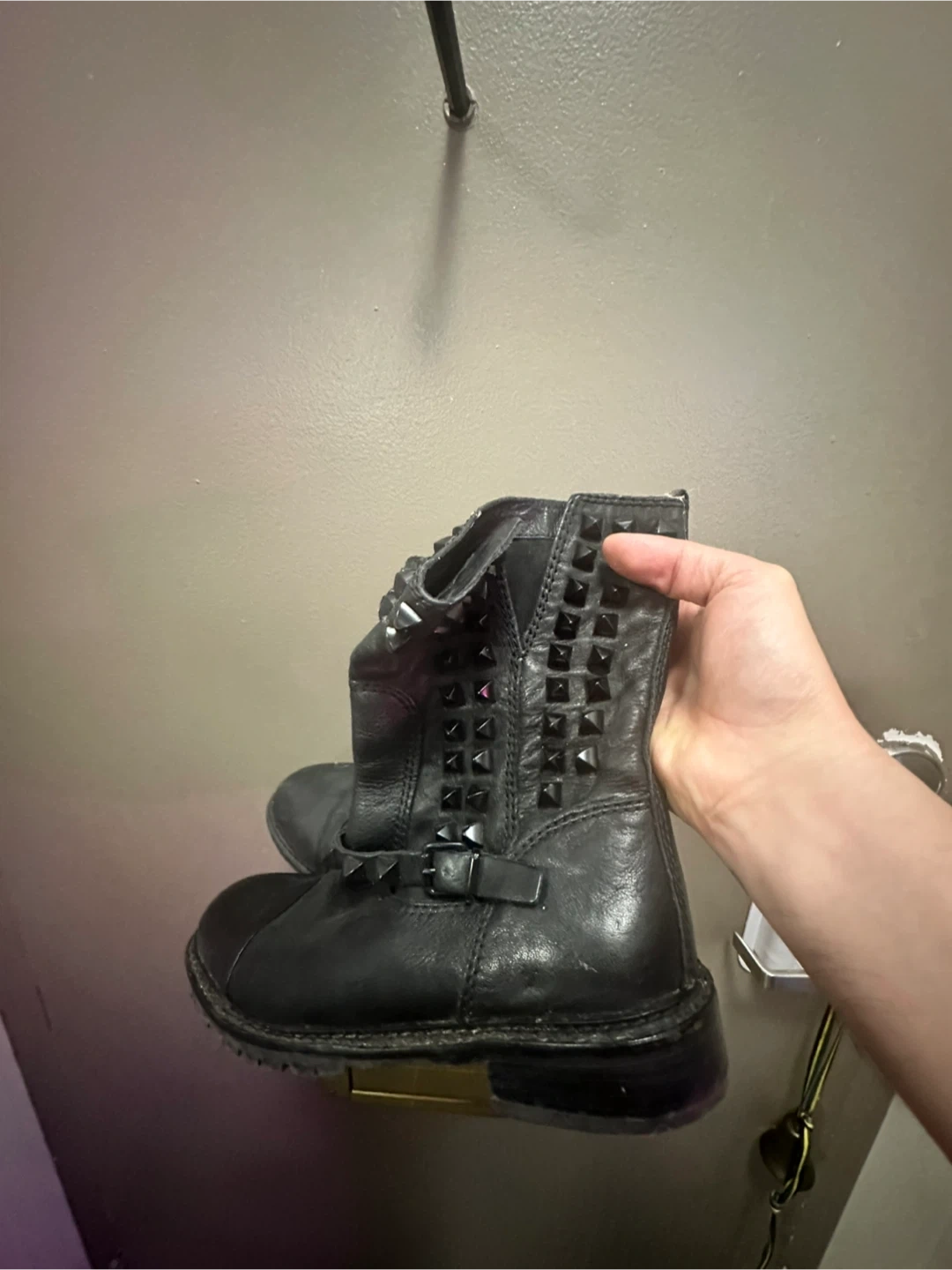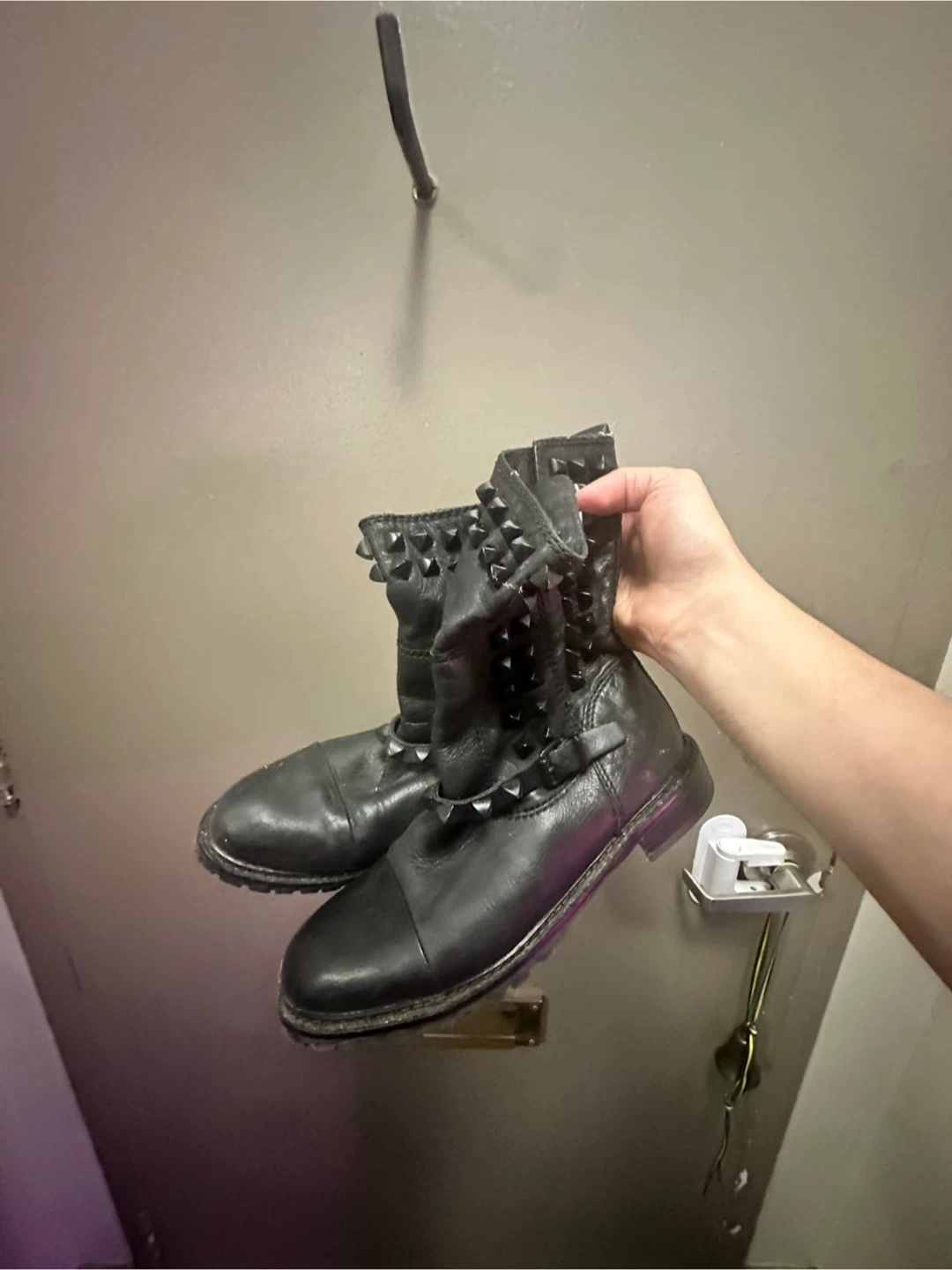 Selling a couple pairs of used boots. One pair is a light brown suede, and the other is a black leather with studs. Both show signs of wear.