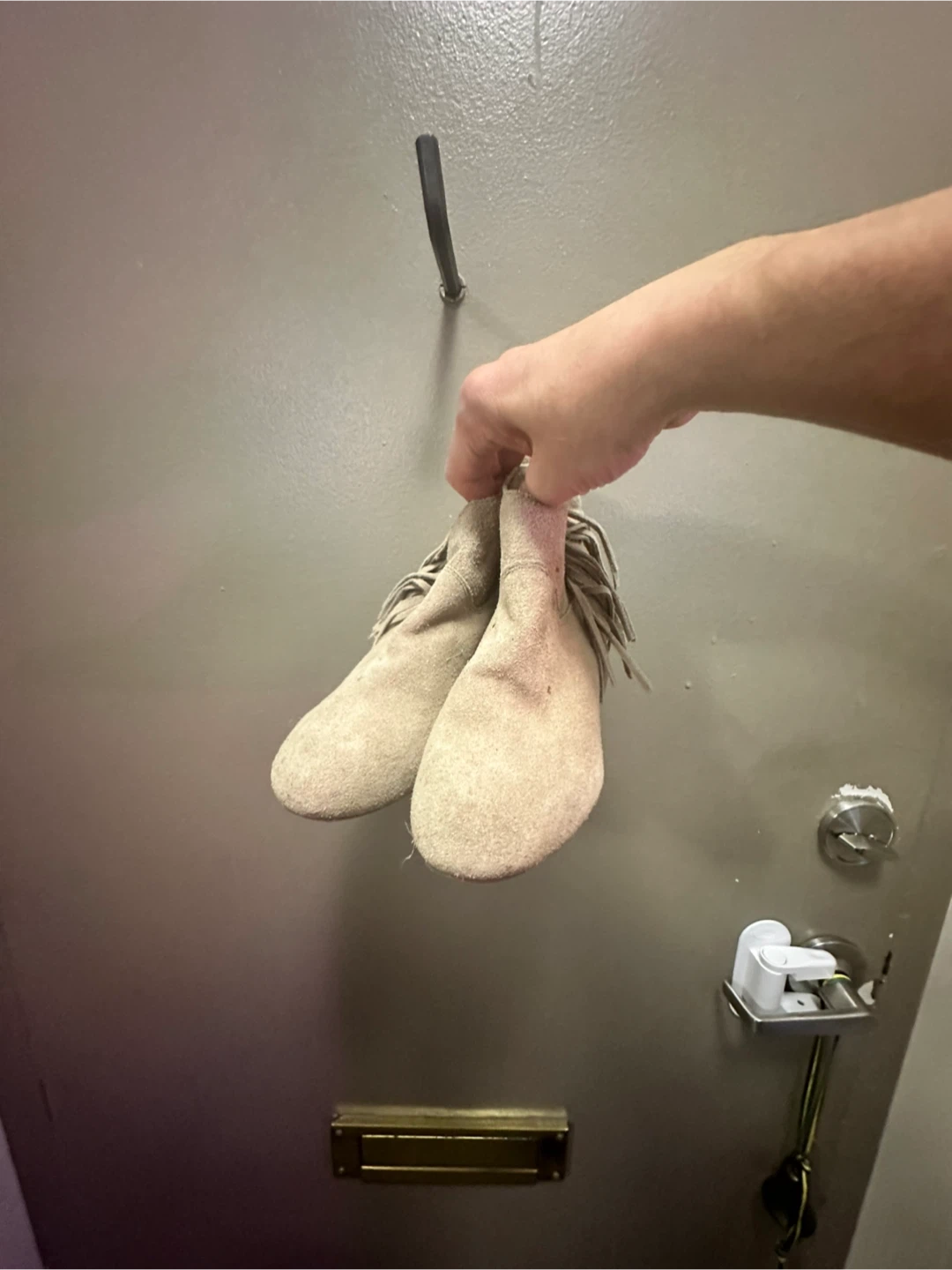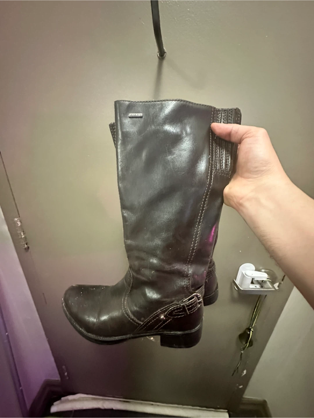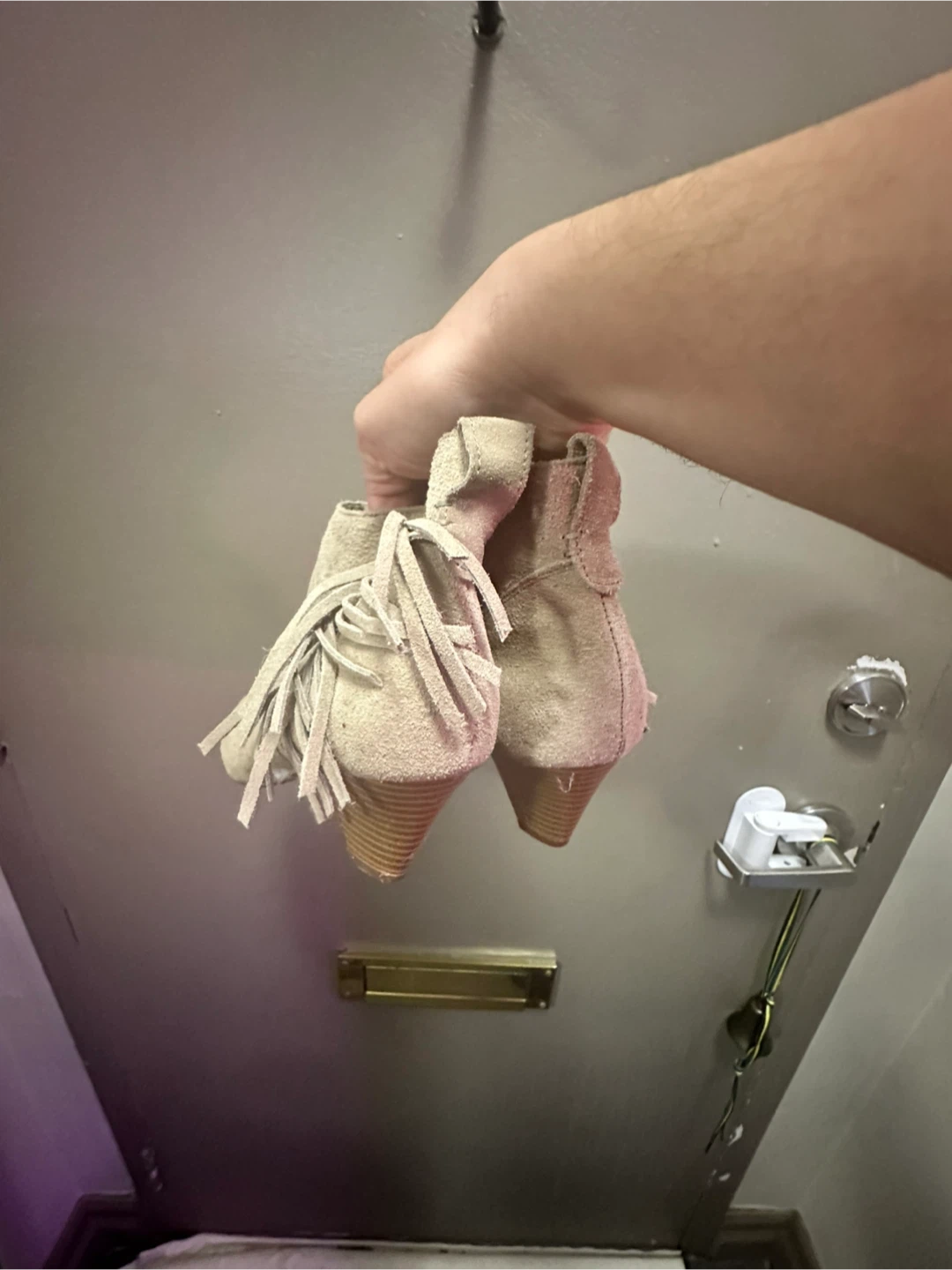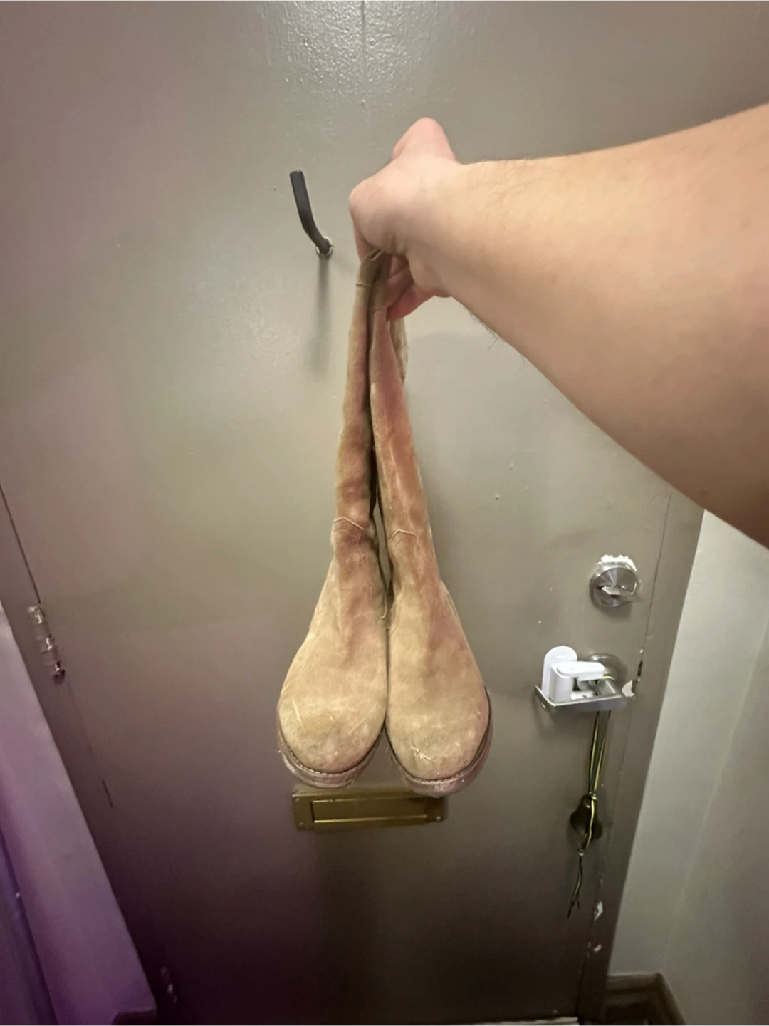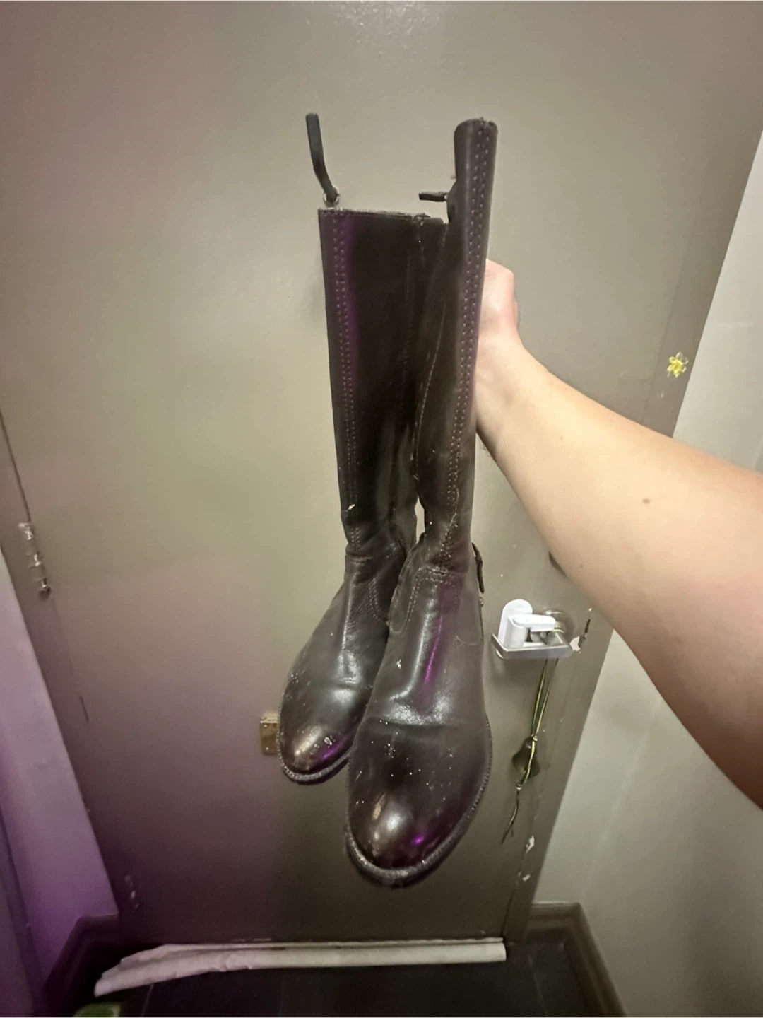 Selling a couple pairs of used boots. One pair is a light brown suede, and the other is a black leather with studs. Both show signs of wear.