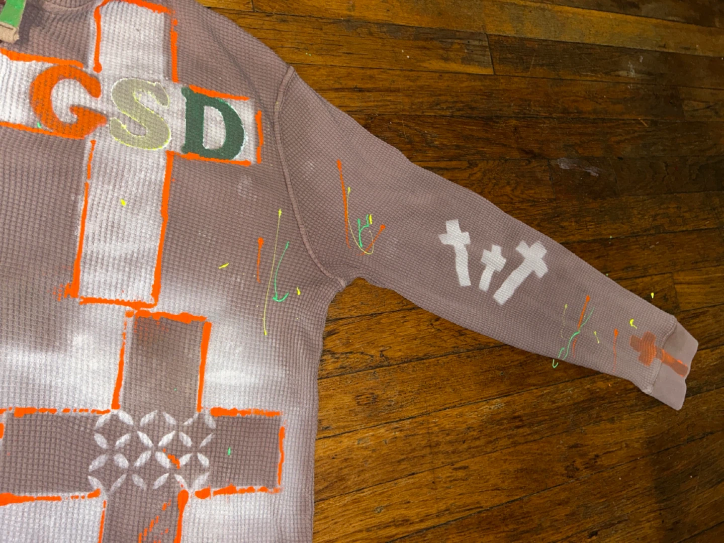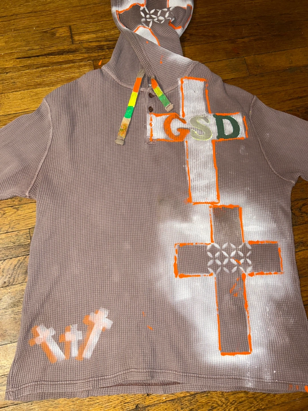 Selling a unique custom hoodie with a graphic design. It features crosses and the letters 'GSD'. The hoodie is a light brown color and has a waffle-like texture. It's definitely a statement piece!