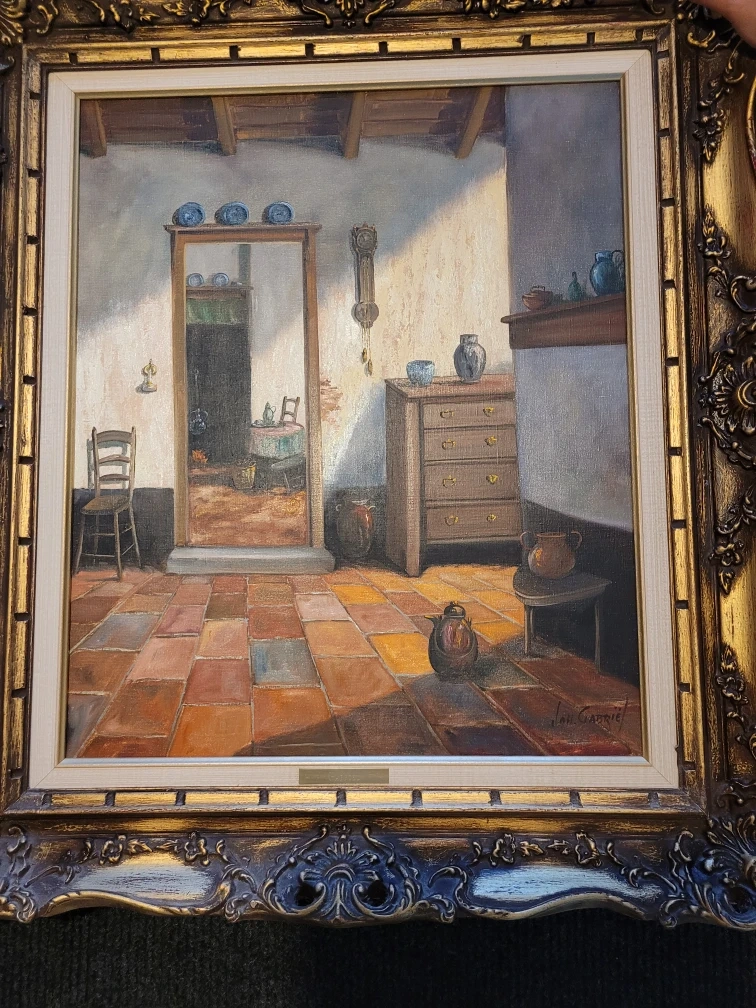 This is a beautiful framed oil painting signed by Jon Gabriel. It depicts an interior scene with a mirror, furniture, and various objects. The frame is ornate with gold and blue detailing, adding to the painting's charm and appeal.