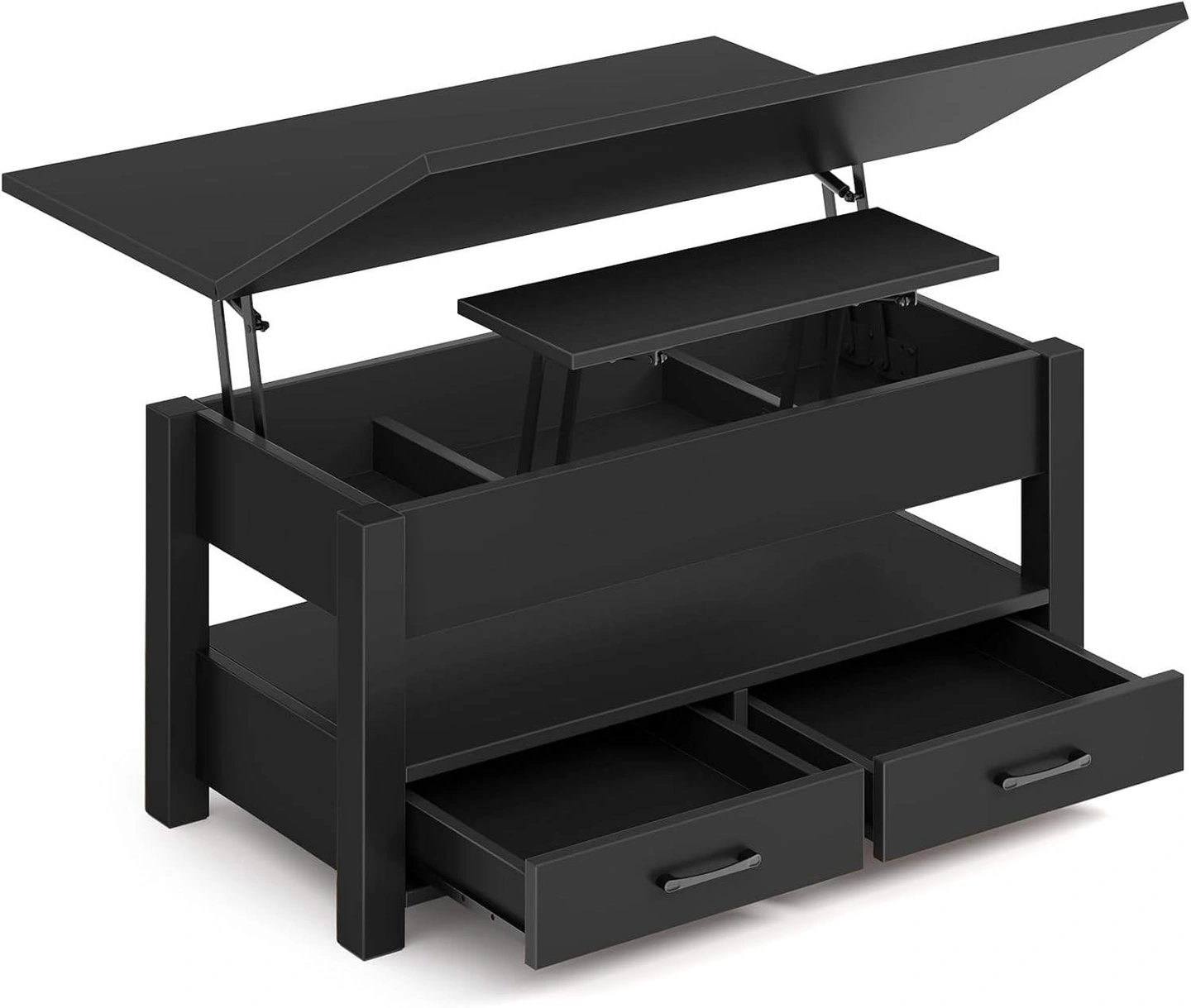 This black lift-top coffee table is perfect for small spaces! It can be used as a regular coffee table, a one-side lift-top coffee table, a two-way lift-top coffee table, or even a dining table for 4-8 people.