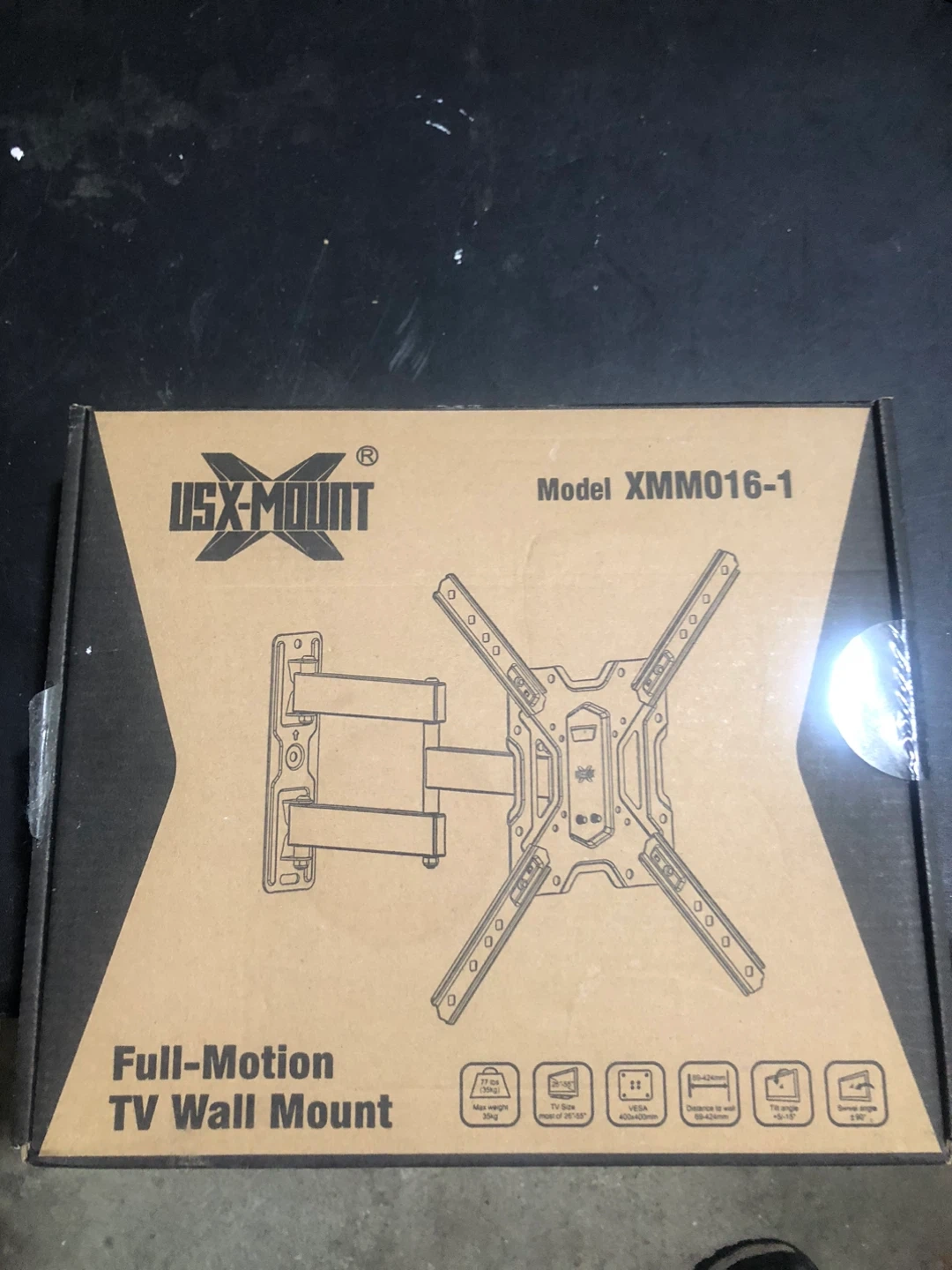 Selling a USX-MOUNT full-motion TV wall mount, model XMM016-1. It supports TVs from 26" to 55" and has a VESA compatibility of 400x400mm. The mount can hold a max weight of 77 lbs (35kg) and offers a tilt angle of -5 to -15 degrees and a swivel angle of ±90 degrees
