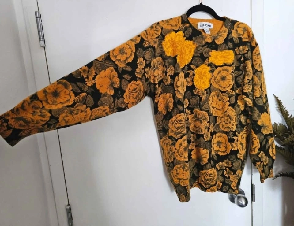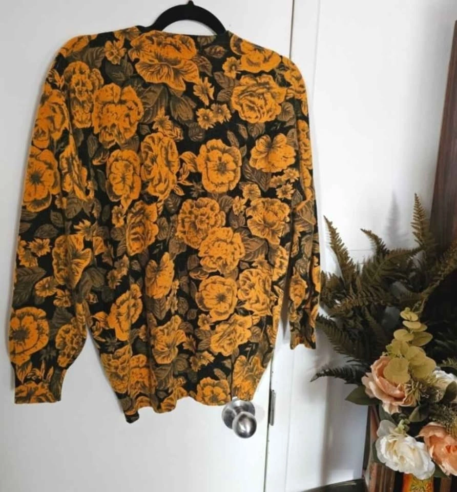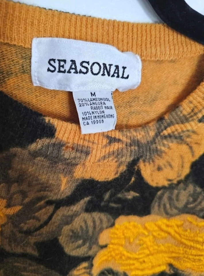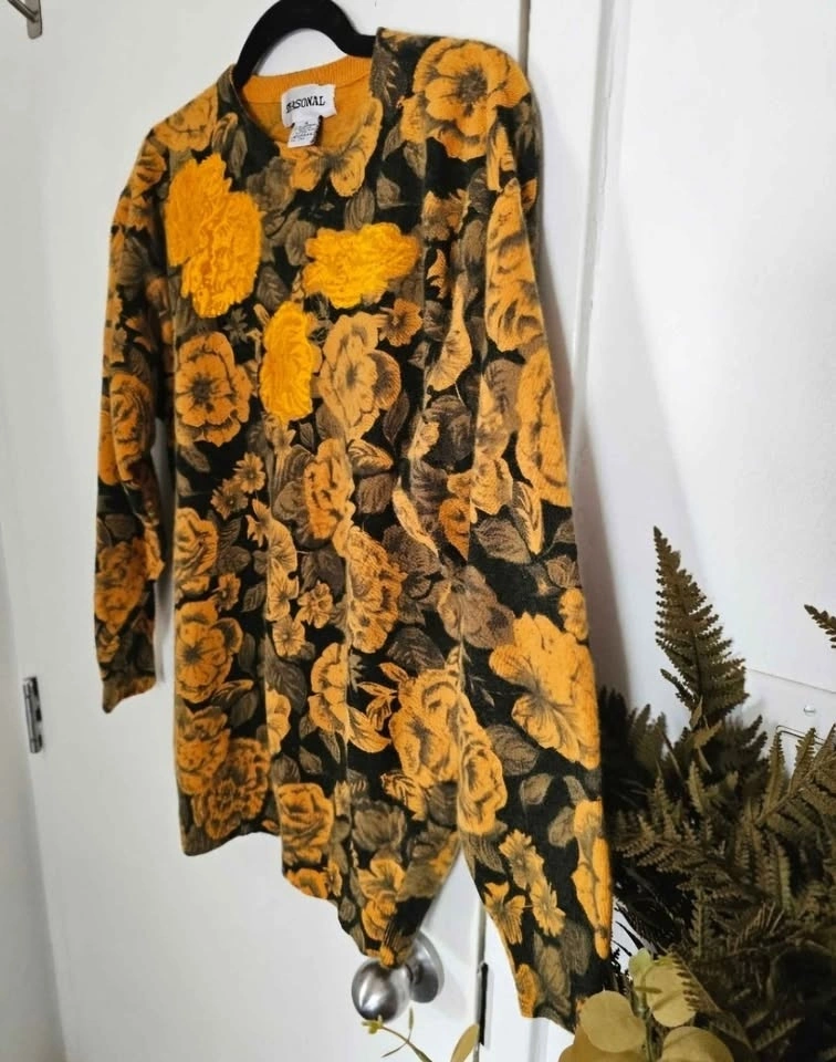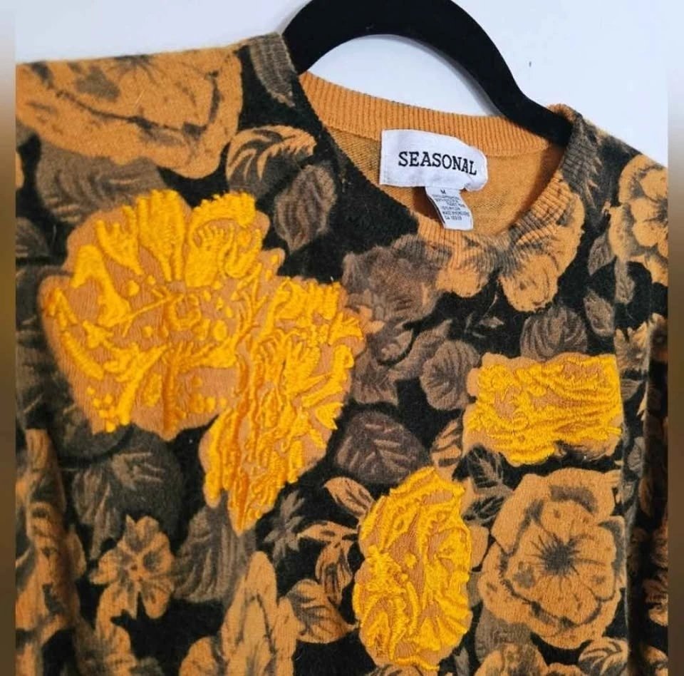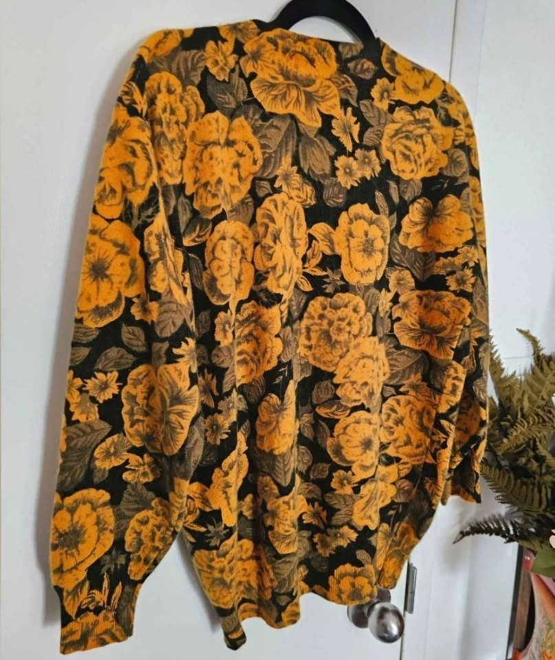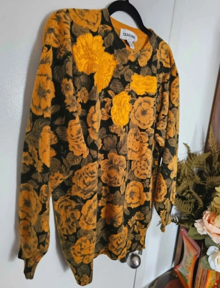 Unique vintage mens/ unisex knit crewneck sweater in mustard/ ochre yellow, muted green, and black, with an all-over pattern of roses and other flowers. Mustard yellow embroidery on the chest area accents some of the flowers. Sweater is made of 70% lambs wool, 20% angora rabbit hair, and 10% nylon. It is very soft and very warm without being bulky.