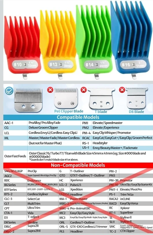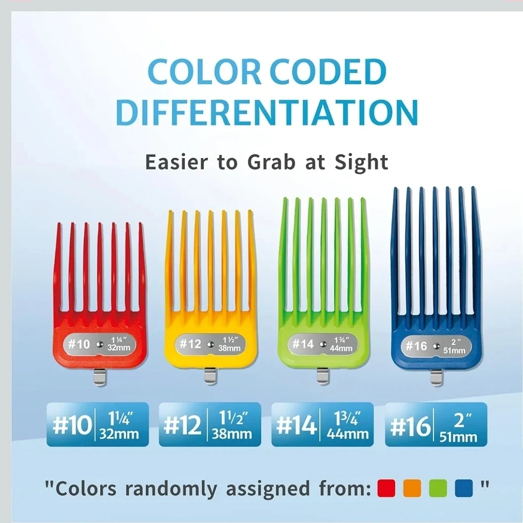 This set includes 4 pieces of clipper guards in sizes #10 (1 1/4", 32mm), #12 (1 1/2", 38mm), #14 (1 3/4", 44mm), and #16 (2", 51mm)