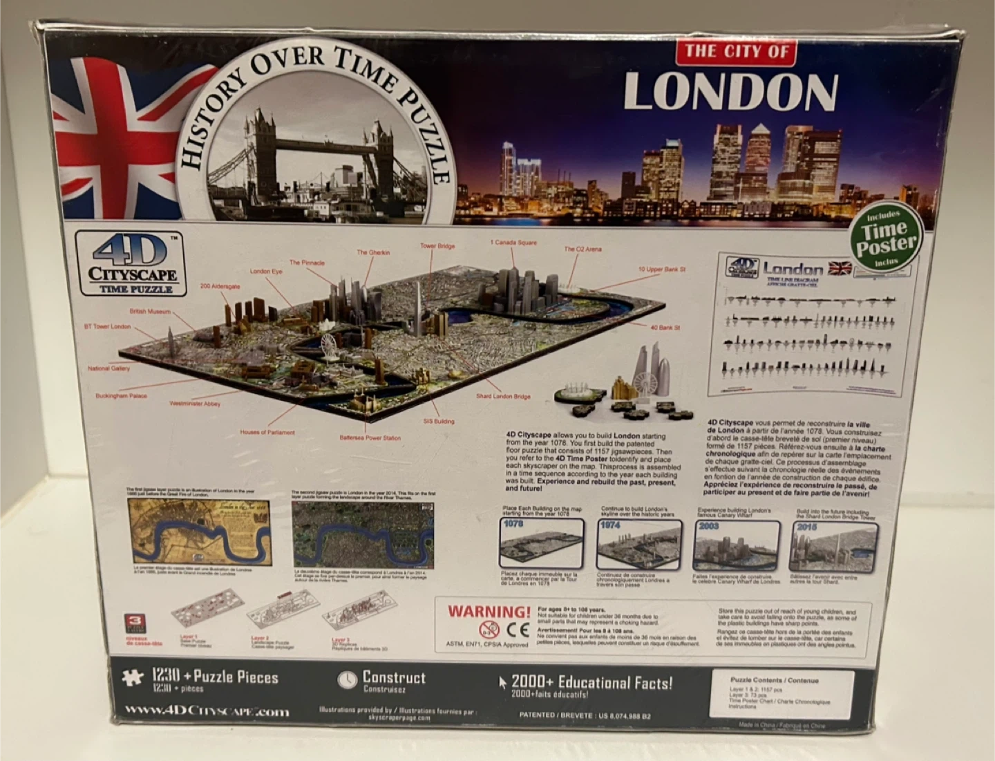 Selling a brand new City of London 4D Cityscape Time Puzzle! It's a history over time puzzle with 1230+ pieces. Recommended for ages 8+. Includes a time poster and lets you rebuild the past, present, and future parts of London. Construct illustrations are provided