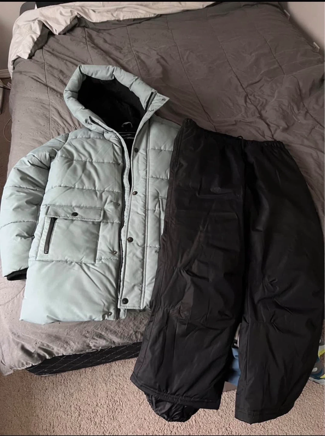 Selling a George brand kids' snowsuit in size XL (14-16). The set includes a light blue/grey puffer jacket and black snow pants. Perfect for keeping your little one warm and dry this winter!