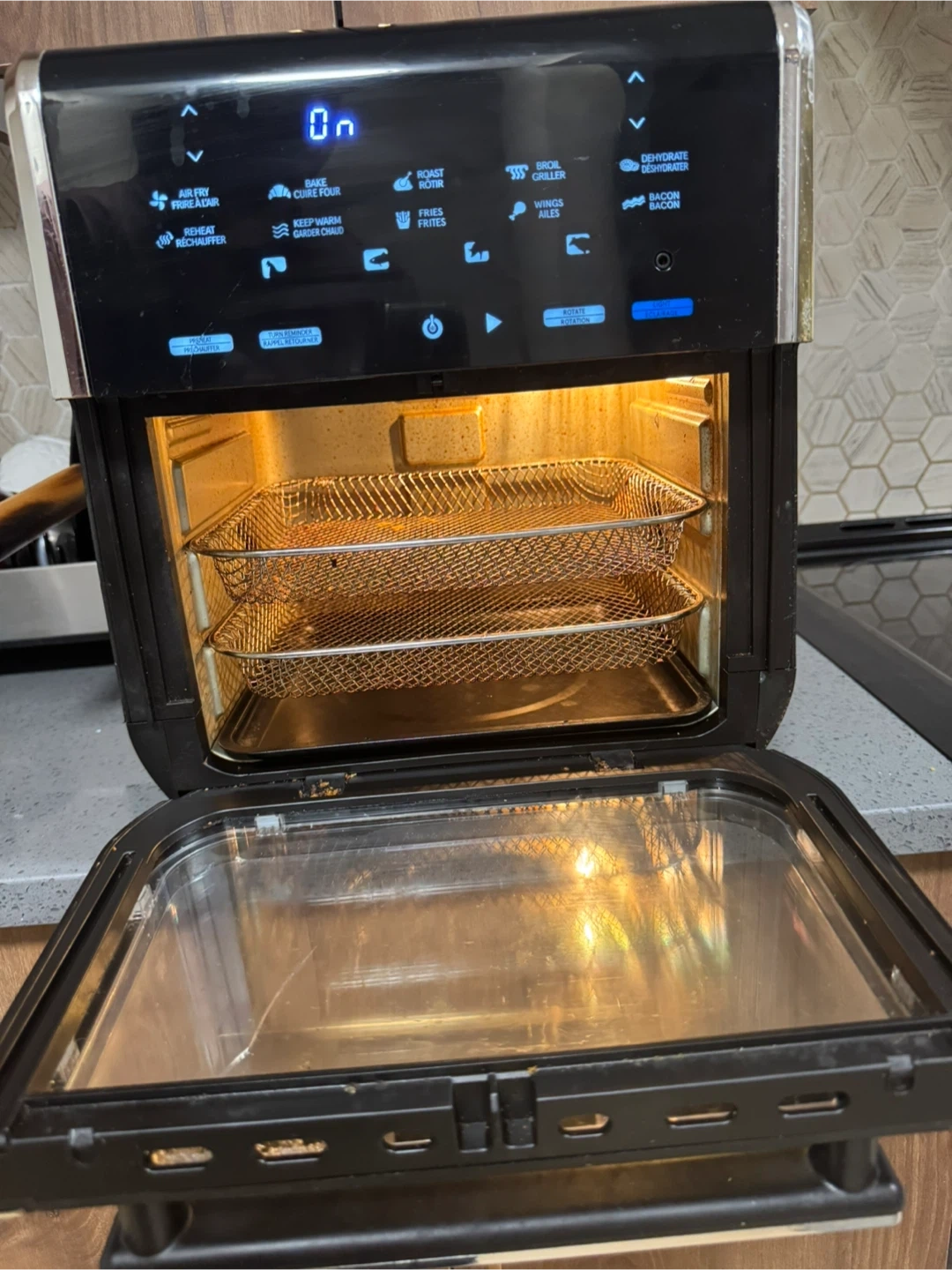 Comes with 28 cooking presets, rotisserie function, dehydrator, and a large family-size capacity. Easy to use and cooks fast with less oil.