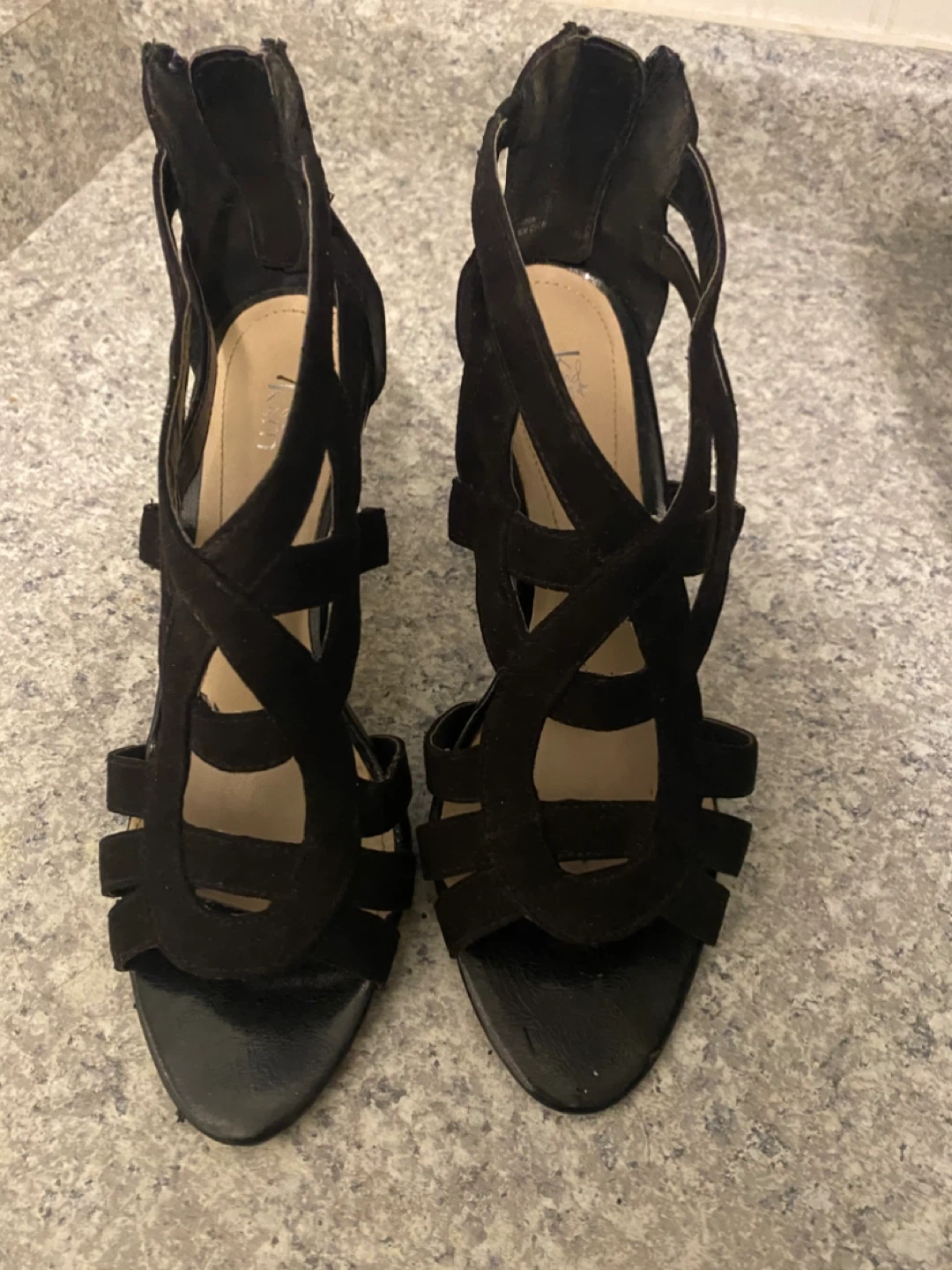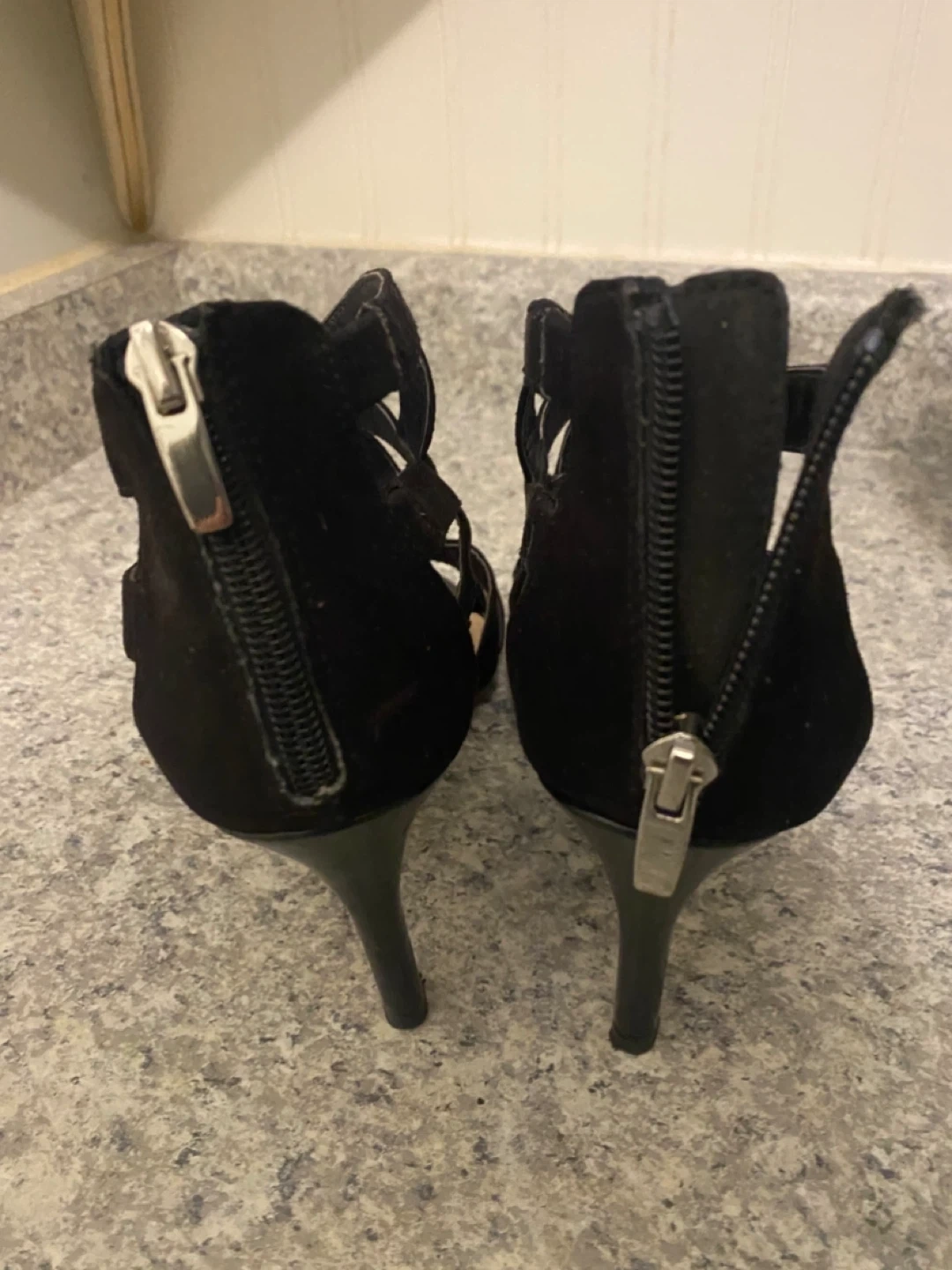 Selling a pair of black high heel sandals. They're in good condition and would be perfect for a night out or a special occasion. Size 8.
