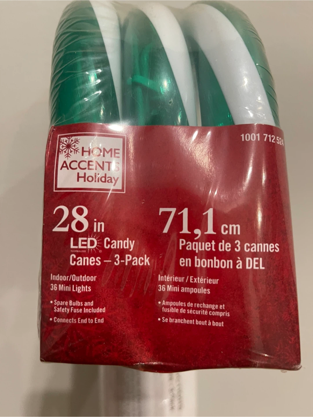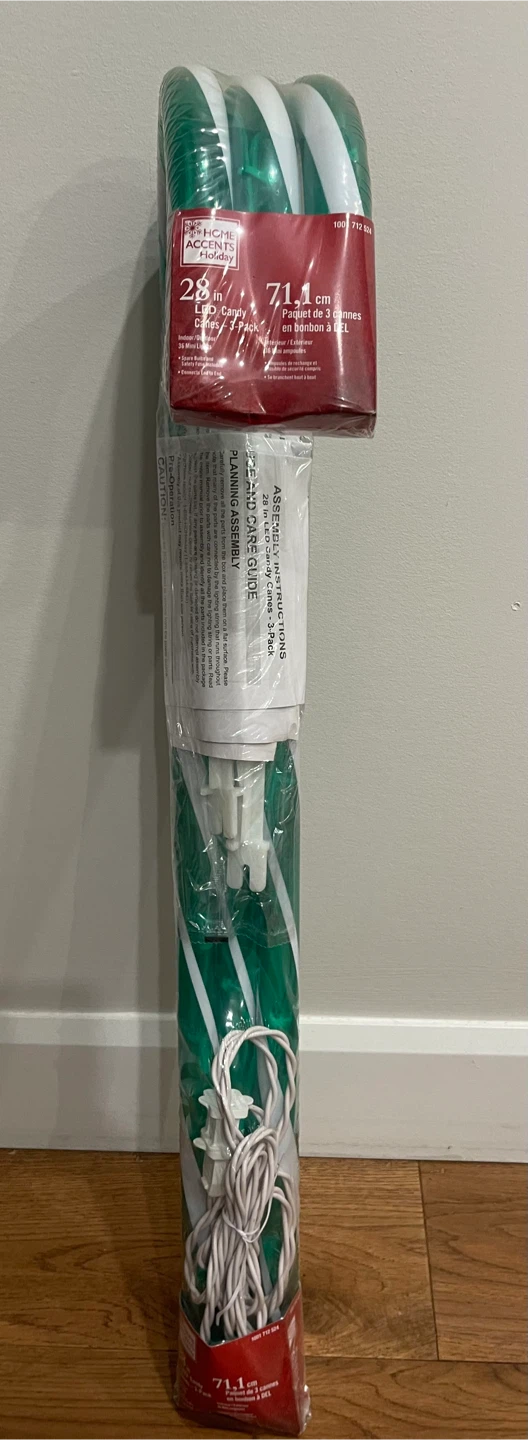 I'm selling a brand new pack of Green/White Home Accents Holiday LED Candy Canes! This 3-pack includes candy canes that are 28 inches (71.1 cm) tall. They're suitable for both indoor and outdoor use and come with 36 mini lights. Instructions & stakes are also included, and they can connect end to end!