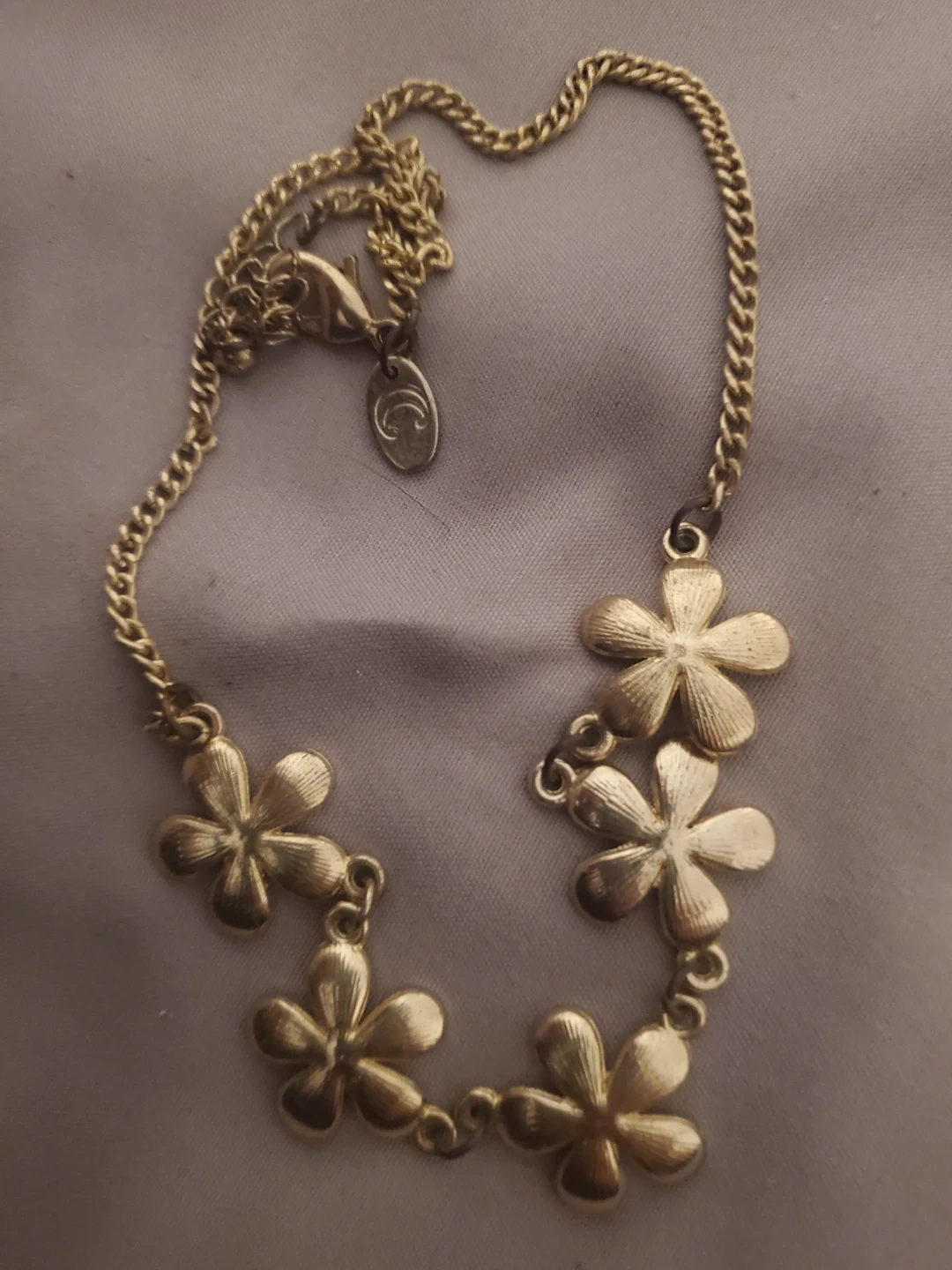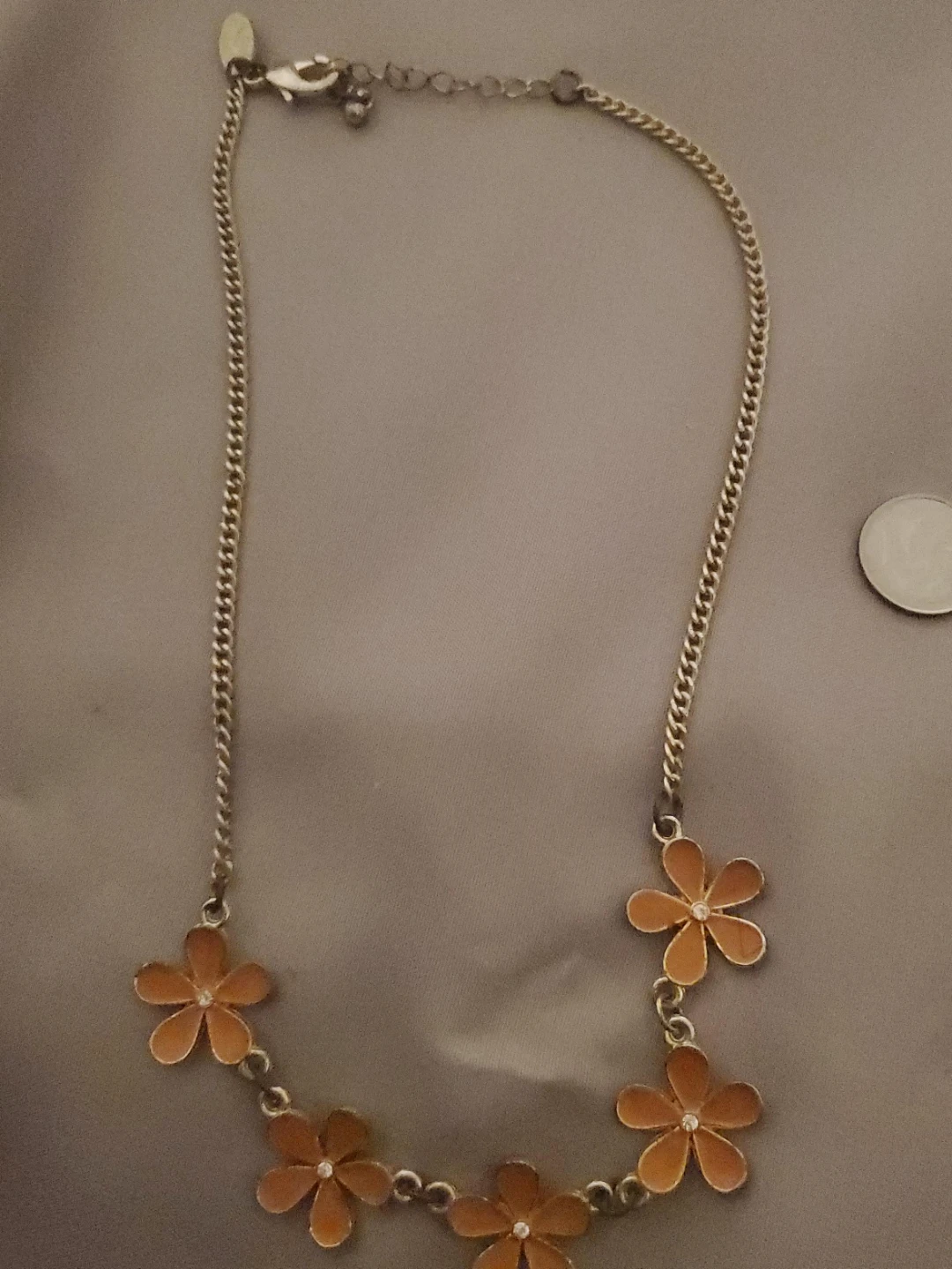 This is a cute flower necklace from Charming Charlie. The necklace is gold in color with orange flowers. It's in great condition and ready to add a pop of color to your outfit